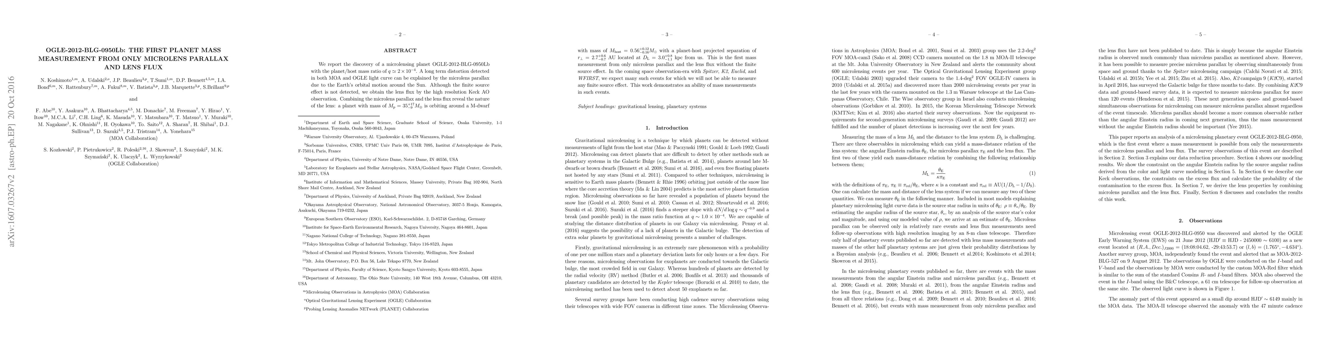 This paper reports the first mass measurement of a microlensing planet, OGLE-2012-BLG-0950Lb, using microlens parallax and lens flux, revealing a planet with mass $M_{\rm p} = 35^{+17}_{-9} M_{\oplus}$ orbiting an M-dwarf at a distance of $D_{\rm L} = 3.0^{+0.8}_{-1.1}$ kpc. This method will be crucial in future space missions where finite source effects are undetectable.