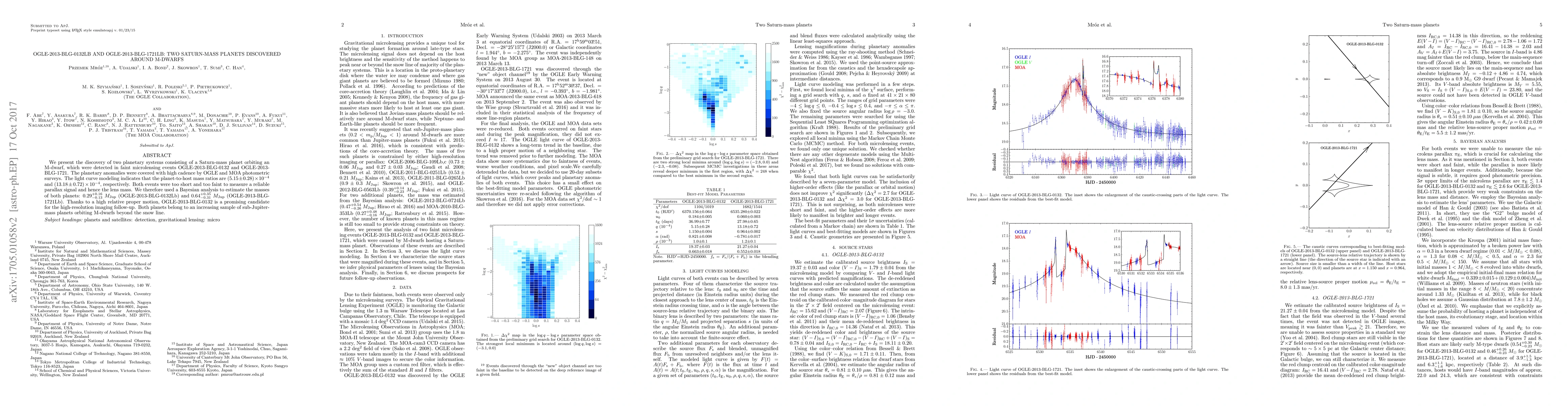 This paper reports the discovery of two Saturn-mass planets orbiting M-dwarfs through microlensing events. The planets, OGLE-2013-BLG-0132Lb and OGLE-2013-BLG-1721Lb, were detected via photometric surveys and modeled to have masses of approximately 0.3 and 0.6 Jupiter masses, respectively.