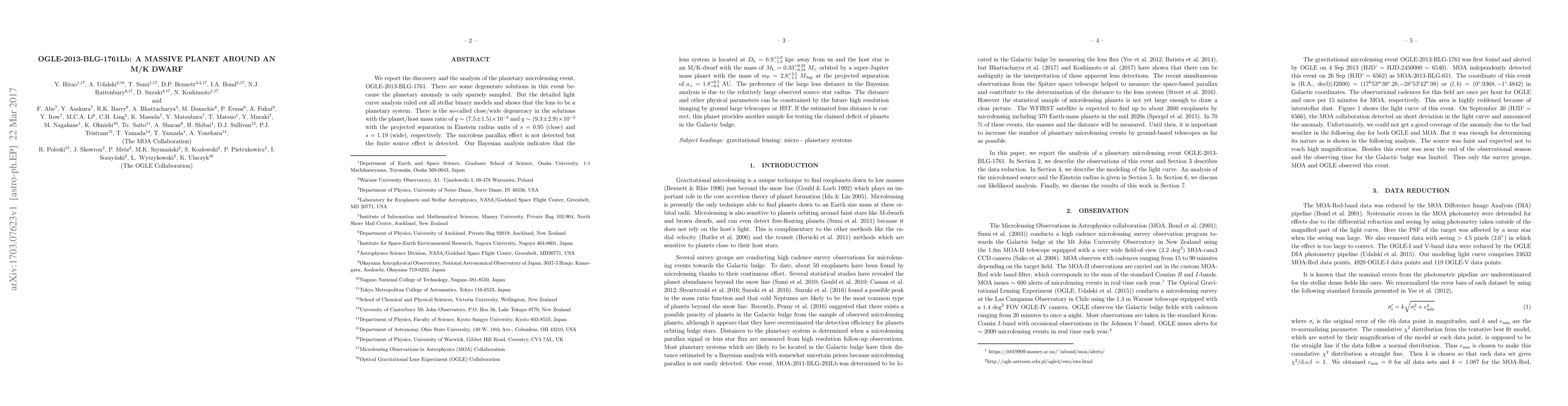 The paper reports the discovery of a massive planet, OGLE-2013-BLG-1761Lb, orbiting an M/K dwarf star through microlensing analysis. The planet has a mass ratio of approximately 0.0075-0.0093 and is located at a projected separation of 1.8 AU, suggesting it is a super-Jupiter mass planet.