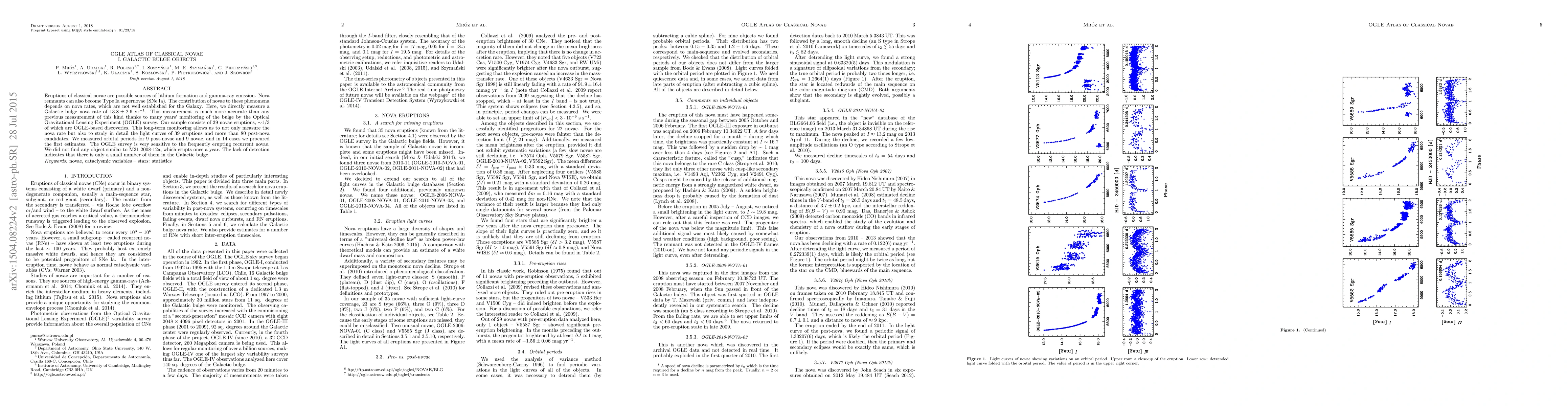 Eruptions of classical novae are possible sources of lithium formation and gamma-ray emission. Nova remnants can also become Type Ia supernovae (SNe Ia). The contribution of novae to these phenomena depends on nova rates, which are not well established for the Galaxy. Here, we directly measure a Galactic bulge nova rate of $13.8 \pm 2.6$ per year. This measurement is much more accurate than any previous measurement of this kind thanks to many years' monitoring of the bulge by the Optical Gravitational Lensing Experiment (OGLE) survey. Our sample consists of 39 novae eruptions, $\sim$1/3 of which are OGLE-based discoveries. This long-term monitoring allows us to not only measure the nova rate but also to study in detail the light curves of 39 eruptions and more than 80 post-nova candidates. We measured orbital periods for 9 post-novae and 9 novae, and in 14 cases we procured the first estimates. The OGLE survey is very sensitive to the frequently erupting recurrent novae. We did not find any object similar to M31 2008-12a, which erupts once a year. The lack of detection indicates that there is only a small number of them in the Galactic bulge.
