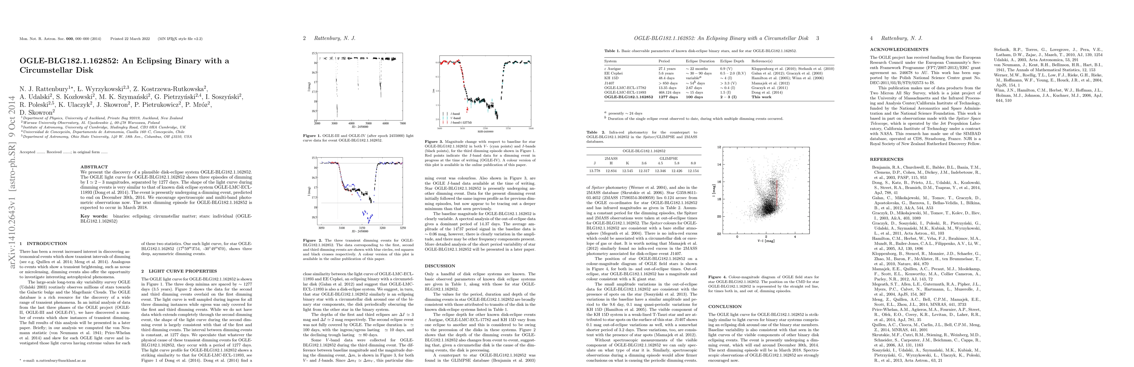 We present the discovery of a plausible disk-eclipse system OGLE-BLG182.1.162852. The OGLE light curve for OGLE-BLG182.1.162852 shows three episodes of dimming by $I \simeq 2 - 3$ magnitudes, separated by 1277 days. The shape of the light curve during dimming events is very similar to that of known disk eclipse system OGLE-LMC-ECL-11893 (Dong et al. 2014). The event is presently undergoing a dimming event, predicted to end on December 30th, 2014. We encourage spectroscopic and multi-band photometric observations now. The next dimming episode for OGLE-BLG182.1.162852 is expected to occur in March 2018.