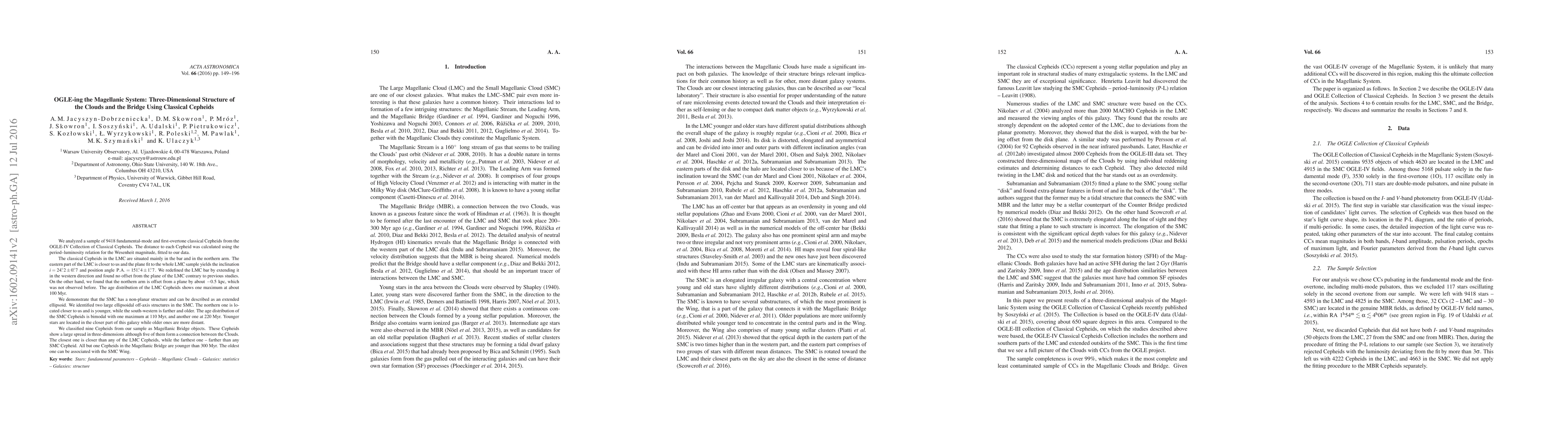 This paper uses Classical Cepheids from the OGLE-IV survey to map the three-dimensional structure of the Large Magellanic Cloud (LMC), Small Magellanic Cloud (SMC), and the Magellanic Bridge. It finds the LMC Cepheids mainly in the bar and northern arm, with an inclination of 24.2°, and identifies an offset in the northern arm. The SMC is shown to have an ellipsoidal structure with two distinct age groups, while the Magellanic Bridge contains Cepheids linking the two Clouds, mostly younger than 300 Myr.