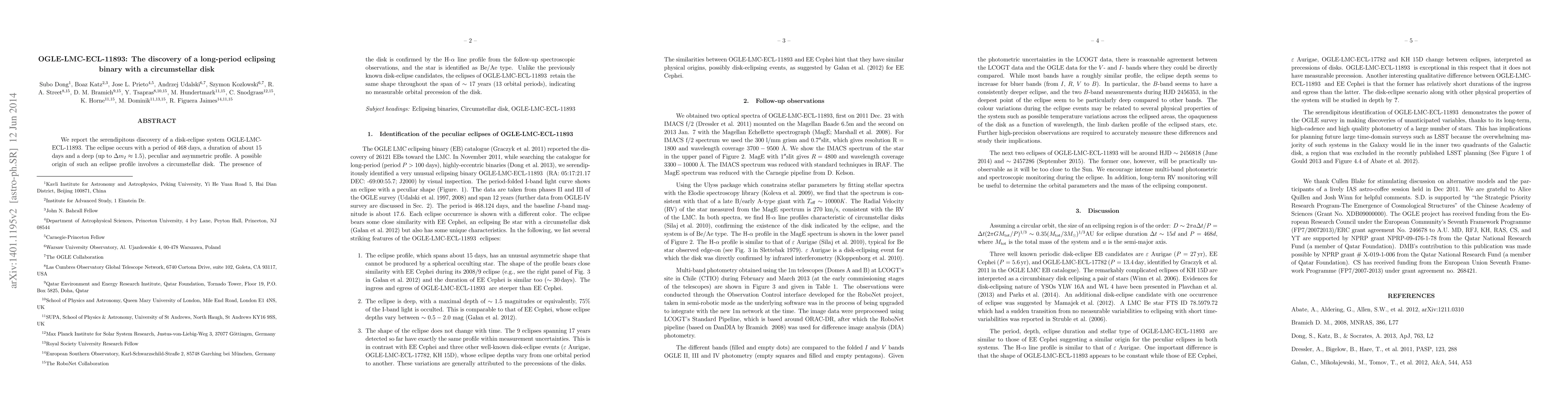 The paper reports the discovery of OGLE-LMC-ECL-11893, a long-period eclipsing binary with a peculiar, asymmetric eclipse profile suggesting a circumstellar disk. Spectroscopic observations confirm the disk's presence and classify the star as Be/Ae type, with no measurable orbital precession over 17 years.