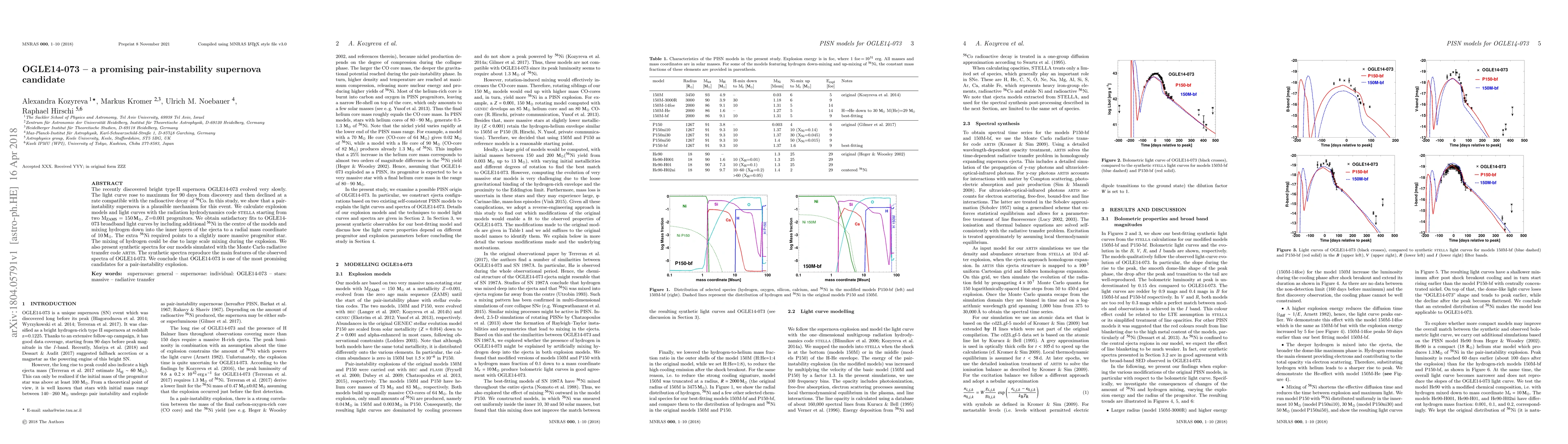OGLE14-073, a slow-evolving bright type II supernova, is identified as a promising pair-instability supernova candidate based on its light curve and synthetic spectra matching models with mixed hydrogen and additional 56Ni. This suggests a progenitor star of around 150 solar masses.