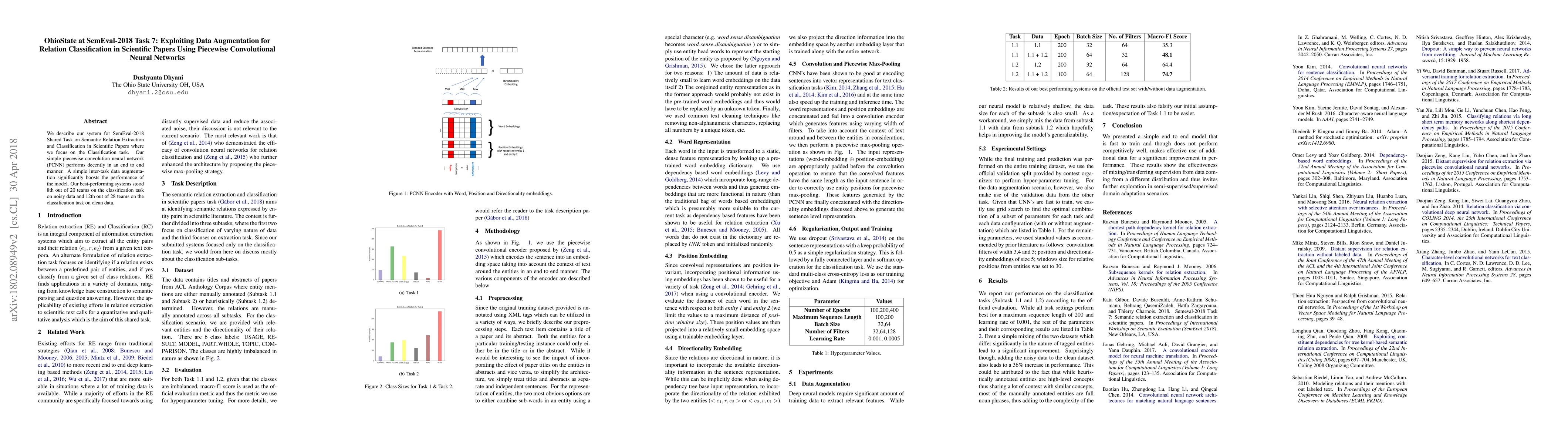 The OhioState team utilized a piecewise convolutional neural network for the SemEval-2018 Task 7, achieving 8th place among 20 teams on noisy data classification. Data augmentation notably improved performance, securing 12th place among 28 teams on clean data classification.