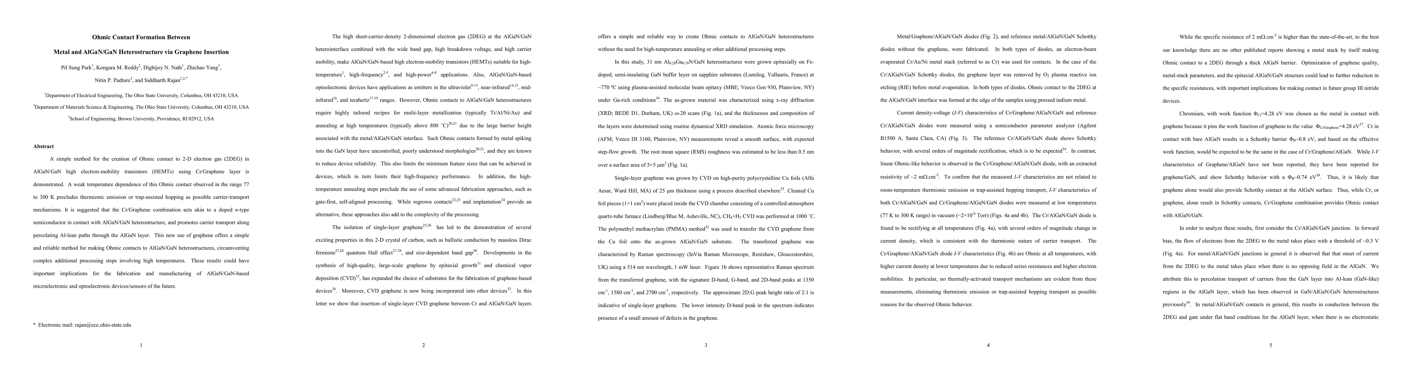 The paper demonstrates a method using Cr/graphene to form Ohmic contacts to AlGaN/GaN heterostructures, showing minimal temperature dependence and suggesting carrier transport through percolating Al-rich paths. This simple technique may improve the manufacturing of future AlGaN/GaN microelectronic and optoelectronic devices.