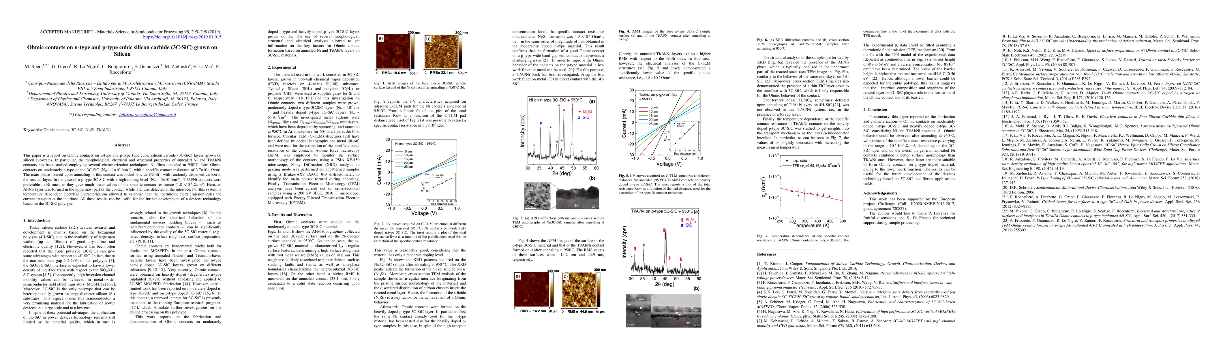 This study investigates Ohmic contacts on n-type and p-type cubic silicon carbide (3C-SiC) layers grown on silicon substrates, showing that Ni contacts are effective for n-type with moderate doping, while Ti/Al/Ni contacts provide lower resistance for highly doped p-type, indicating the importance of contact material choice for device applications.
