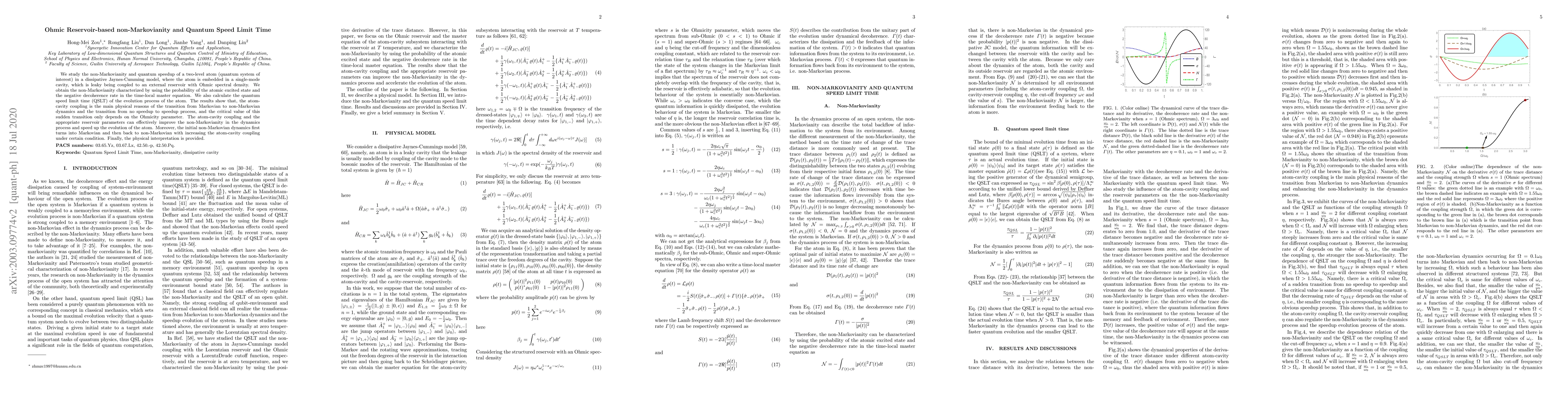 This paper investigates the non-Markovianity and quantum speed limit time in a Jaynes-Cumming model with an atom in a leaky cavity coupled to an Ohmic reservoir. It finds that the atom-cavity coupling induces transitions between Markovian and non-Markovian dynamics and can lead to quantum speedup, with the critical transition value dependent on the Ohmicity parameter.