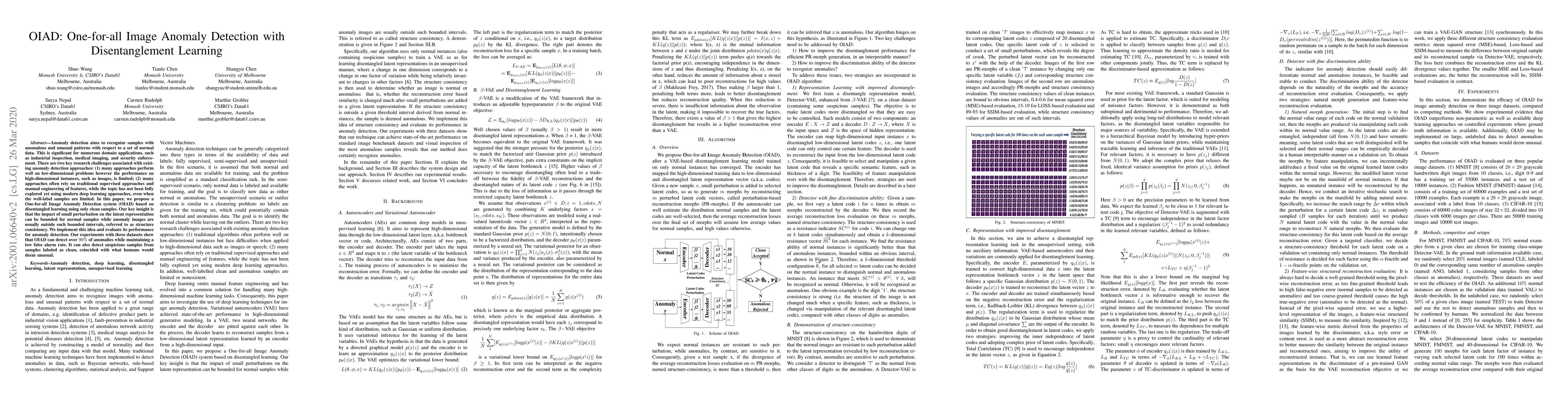 Anomaly detection aims to recognize samples with anomalous and unusual patterns with respect to a set of normal data. This is significant for numerous domain applications, such as industrial inspection, medical imaging, and security enforcement. There are two key research challenges associated with existing anomaly detection approaches: (1) many approaches perform well on low-dimensional problems however the performance on high-dimensional instances, such as images, is limited; (2) many approaches often rely on traditional supervised approaches and manual engineering of features, while the topic has not been fully explored yet using modern deep learning approaches, even when the well-label samples are limited. In this paper, we propose a One-for-all Image Anomaly Detection system (OIAD) based on disentangled learning using only clean samples. Our key insight is that the impact of small perturbation on the latent representation can be bounded for normal samples while anomaly images are usually outside such bounded intervals, referred to as structure consistency. We implement this idea and evaluate its performance for anomaly detection. Our experiments with three datasets show that OIAD can detect over $90\%$ of anomalies while maintaining a low false alarm rate. It can also detect suspicious samples from samples labeled as clean, coincided with what humans would deem unusual.