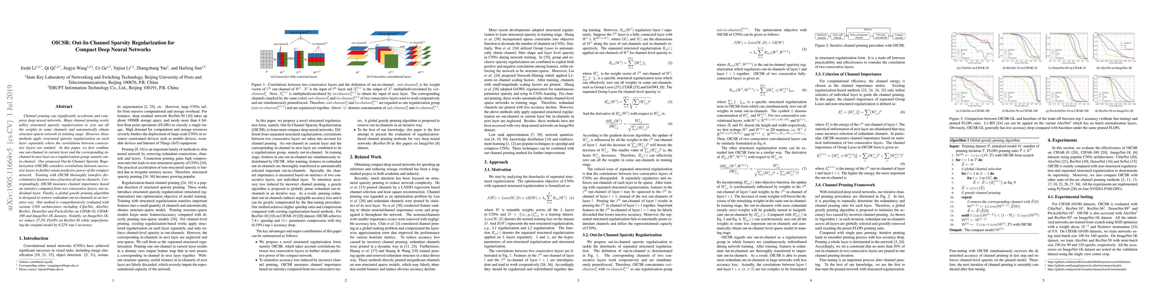 The paper proposes Out-In-Channel Sparsity Regularization (OICSR) to enhance channel pruning in deep neural networks by considering correlations between consecutive layers. This method outperforms the original model on ImageNet-1K by 0.22% top-1 accuracy while reducing 37.2% FLOPs on ResNet-50.