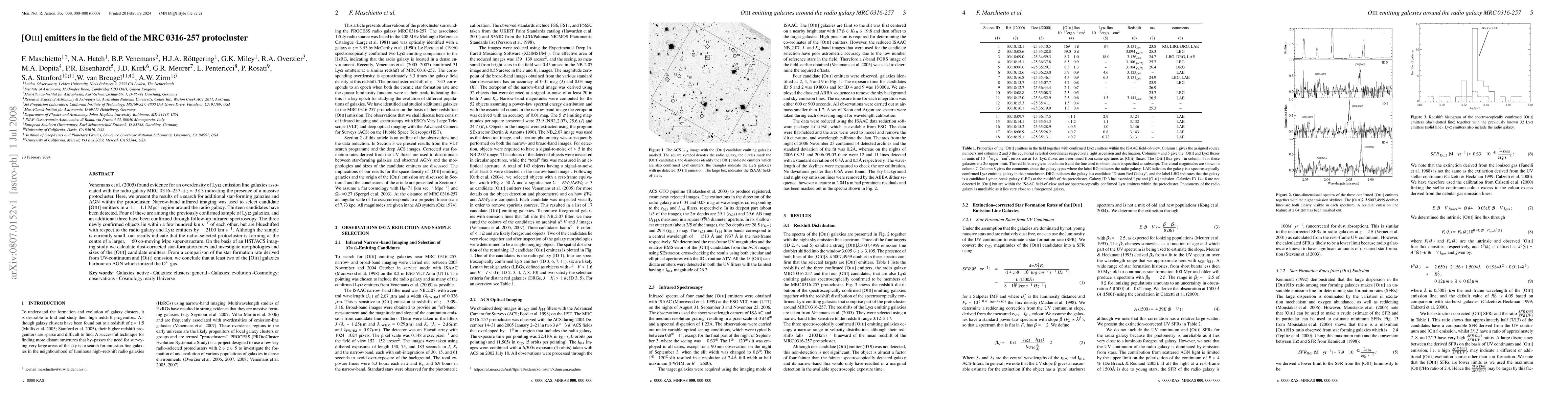 Venemans et al. (2005) identified a protocluster around the radio galaxy MRC 0316-257 at z=3.13 using Ly-alpha emission lines. This study detected additional [O III] emitters in the same region, indicating star-forming galaxies and AGN, suggesting the presence of a larger, ~60 co-moving Mpc super-structure.