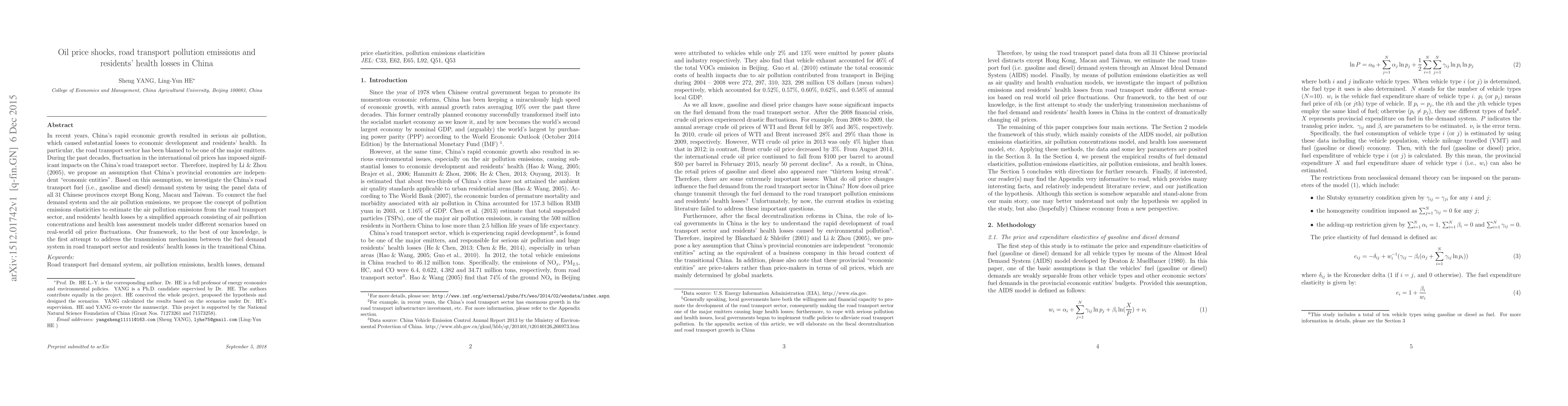This paper investigates the impact of oil price shocks on road transport pollution emissions and residents' health in China using provincial panel data. It proposes a framework to estimate the pollution emissions and health losses from road transport, linking fuel demand to air pollution and health outcomes under varying oil price scenarios.
