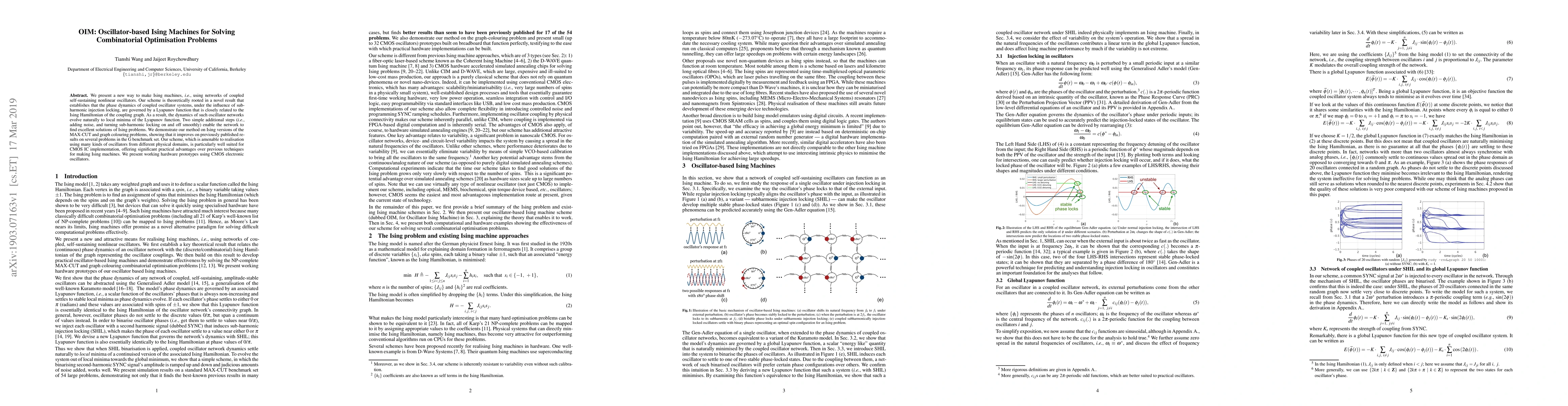 This paper introduces Oscillator-based Ising Machines (OIM) that leverage coupled nonlinear oscillators to solve combinatorial optimisation problems. The method uses a Lyapunov function related to the Ising Hamiltonian, demonstrating improved performance on MAX-CUT and graph colouring problems, with practical CMOS IC implementation potential.