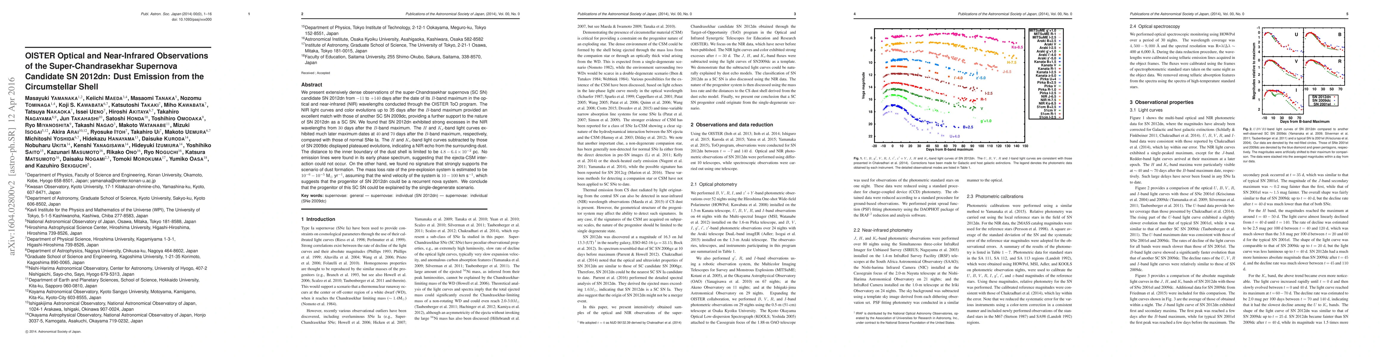 This paper presents optical and near-infrared observations of the super-Chandrasekhar supernova candidate SN 2012dn, finding strong NIR excesses and dust emission from its circumstellar shell, supporting its classification as a super-Chandrasekhar supernova and suggesting a single-degenerate progenitor scenario.