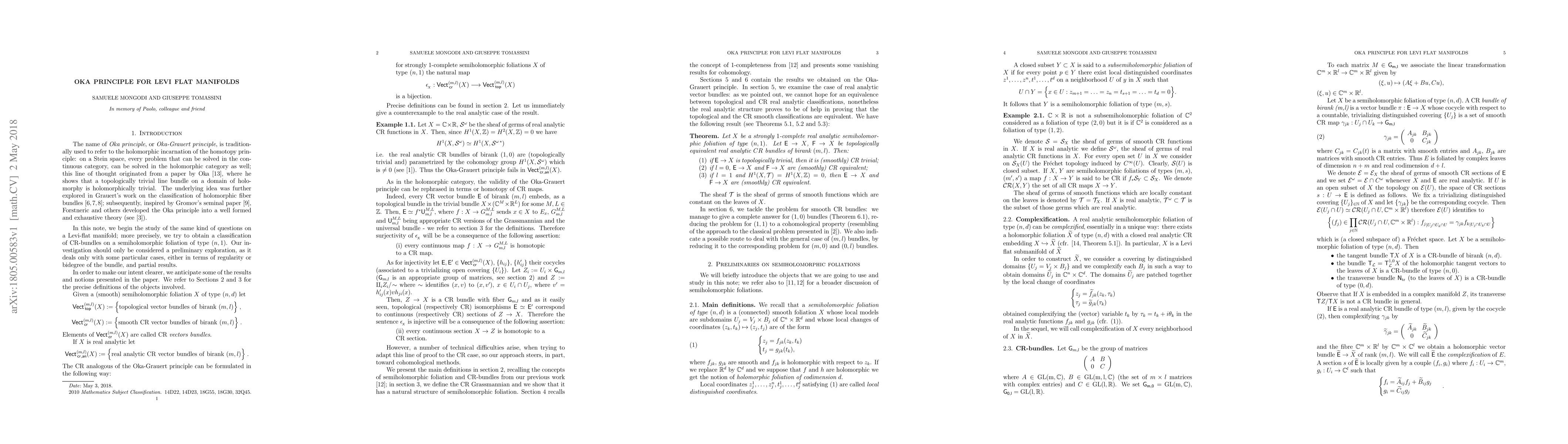 The Oka principle is extended to Levi-flat manifolds, focusing on classifying CR-bundles on semiholomorphic foliations of type (n, 1). This preliminary study explores specific cases and yields partial results.