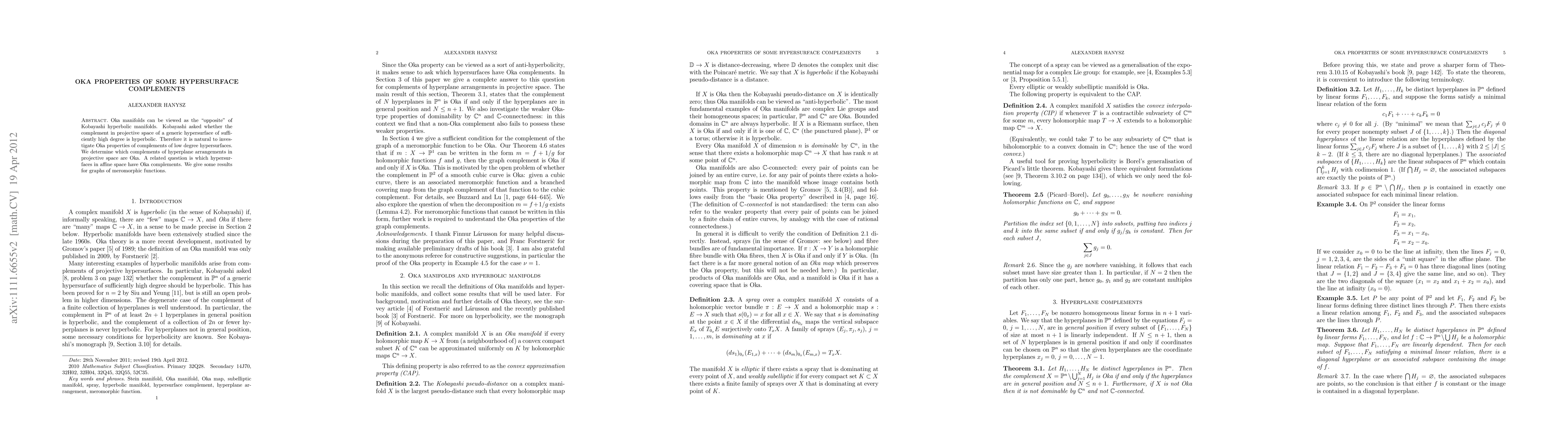 This paper investigates Oka properties of complements of low degree hypersurfaces in projective space, determining which complements of hyperplane arrangements are Oka. It also explores which hypersurfaces in affine space possess Oka complements, providing results for graphs of meromorphic functions.