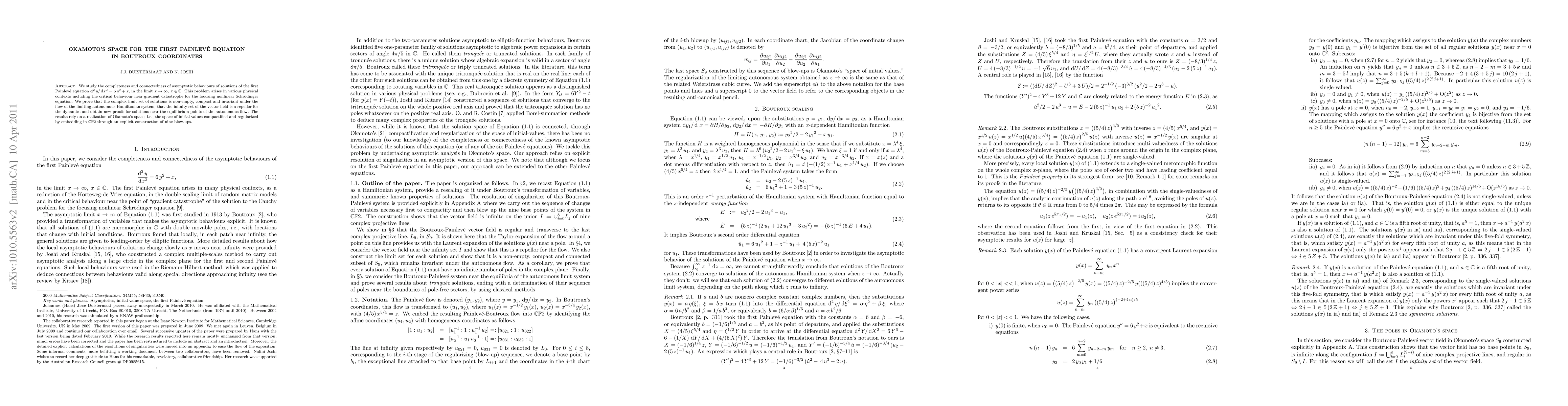 We study the completeness and connectedness of asymptotic behaviours of solutions of the first Painlev\'e equation $\op{d}^2y/\op{d}x^2=6\, y^2+ x$, in the limit $x\to\infty$, $x\in\C$. This problem arises in various physical contexts including the critical behaviour near gradient catastrophe for the focusing nonlinear Schr\"odinger equation. We prove that the complex limit set of solutions is non-empty, compact and invariant under the flow of the limiting autonomous Hamiltonian system, that the infinity set of the vector field is a repellor for the dynamics and obtain new proofs for solutions near the equilibrium points of the autonomous flow. The results rely on a realization of Okamoto's space, i.e., the space of initial values compactified and regularized by embedding in $\C\Proj 2$ through an explicit construction of nine blow-ups.