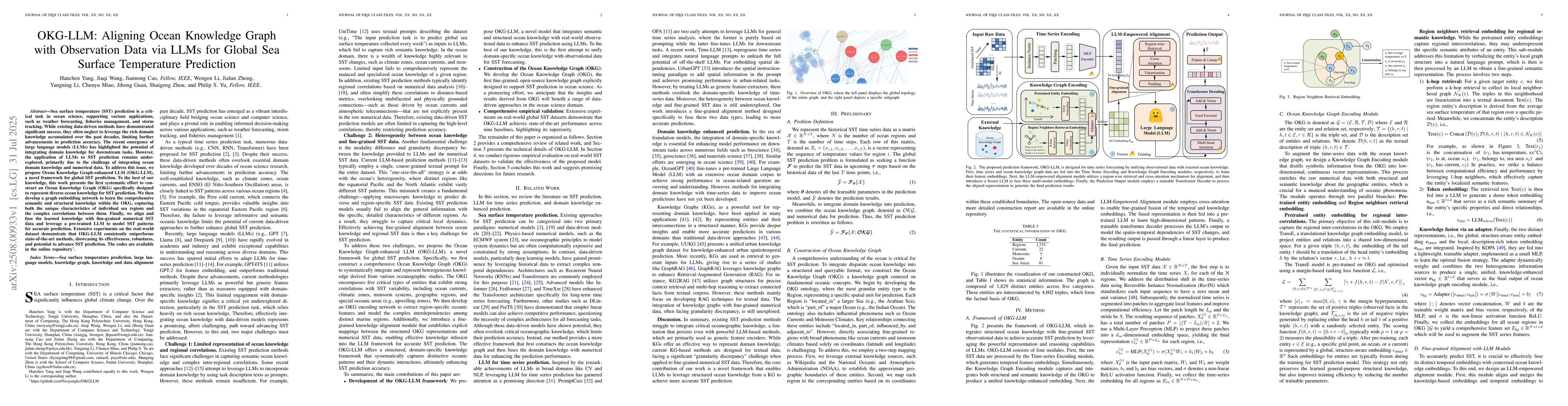 Sea surface temperature (SST) prediction is a critical task in ocean science, supporting various applications, such as weather forecasting, fisheries management, and storm tracking. While existing data-driven methods have demonstrated significant success, they often neglect to leverage the rich domain knowledge accumulated over the past decades, limiting further advancements in prediction accuracy. The recent emergence of large language models (LLMs) has highlighted the potential of integrating domain knowledge for downstream tasks. However, the application of LLMs to SST prediction remains underexplored, primarily due to the challenge of integrating ocean domain knowledge and numerical data. To address this issue, we propose Ocean Knowledge Graph-enhanced LLM (OKG-LLM), a novel framework for global SST prediction. To the best of our knowledge, this work presents the first systematic effort to construct an Ocean Knowledge Graph (OKG) specifically designed to represent diverse ocean knowledge for SST prediction. We then develop a graph embedding network to learn the comprehensive semantic and structural knowledge within the OKG, capturing both the unique characteristics of individual sea regions and the complex correlations between them. Finally, we align and fuse the learned knowledge with fine-grained numerical SST data and leverage a pre-trained LLM to model SST patterns for accurate prediction. Extensive experiments on the real-world dataset demonstrate that OKG-LLM consistently outperforms state-of-the-art methods, showcasing its effectiveness, robustness, and potential to advance SST prediction. The codes are available in the online repository.