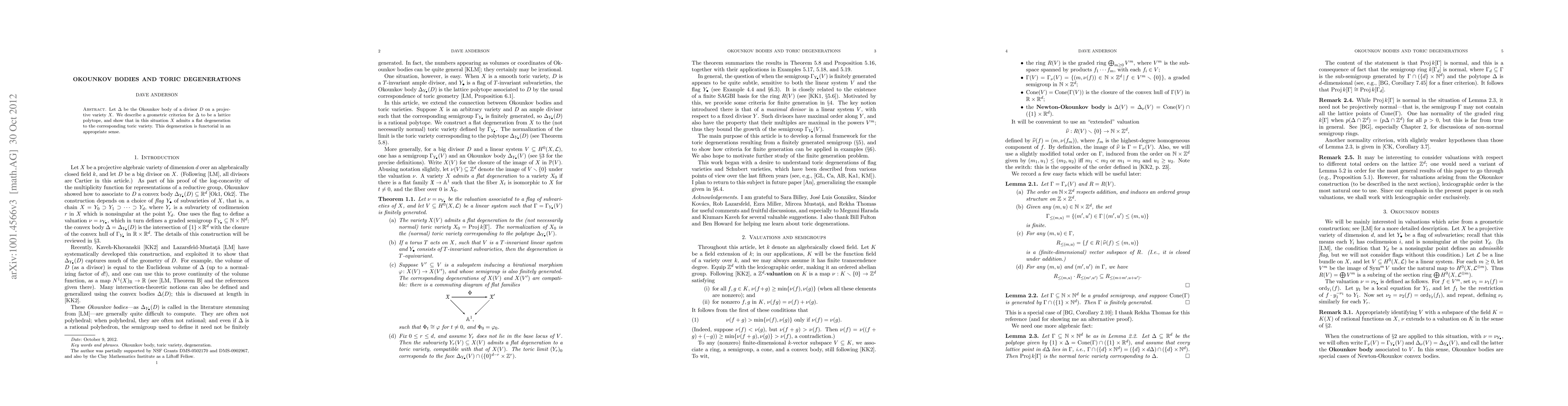 Let \Delta be the Okounkov body of a divisor D on a projective variety X. We describe a geometric criterion for \Delta to be a lattice polytope, and show that in this situation X admits a flat degeneration to the corresponding toric variety. This degeneration is functorial in an appropriate sense.