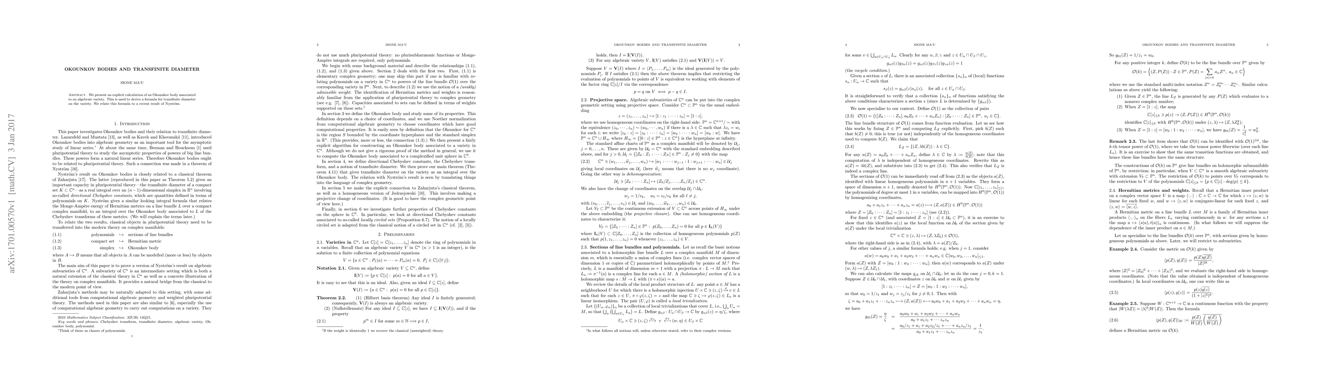 This paper calculates an Okounkov body linked to an algebraic variety and uses it to derive a formula for the transfinite diameter on the variety, connecting the result to a recent finding by D. Witt Nystrom.