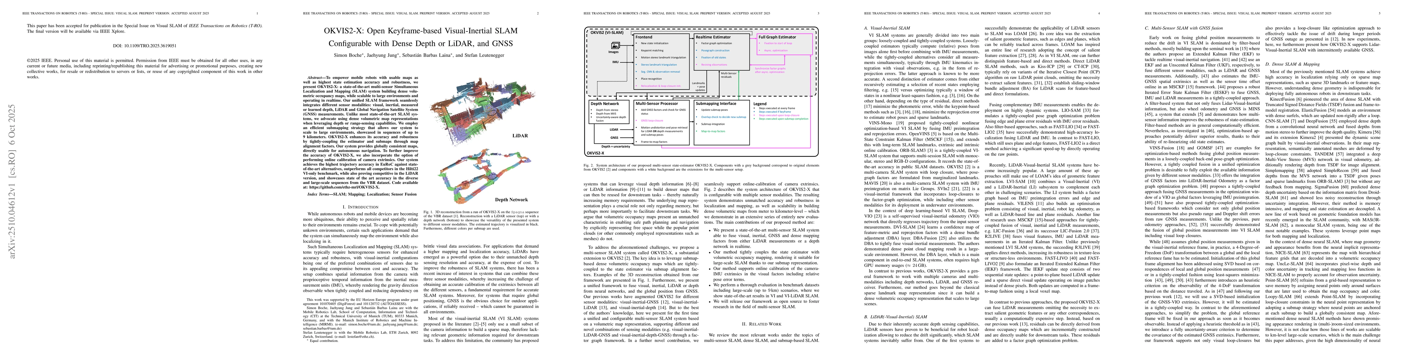 To empower mobile robots with usable maps as well as highest state estimation accuracy and robustness, we present OKVIS2-X: a state-of-the-art multi-sensor Simultaneous Localization and Mapping (SLAM) system building dense volumetric occupancy maps, while scalable to large environments and operating in realtime. Our unified SLAM framework seamlessly integrates different sensor modalities: visual, inertial, measured or learned depth, LiDAR and Global Navigation Satellite System (GNSS) measurements. Unlike most state-of-the-art SLAM systems, we advocate using dense volumetric map representations when leveraging depth or range-sensing capabilities. We employ an efficient submapping strategy that allows our system to scale to large environments, showcased in sequences of up to 9 kilometers. OKVIS2-X enhances its accuracy and robustness by tightly-coupling the estimator and submaps through map alignment factors. Our system provides globally consistent maps, directly usable for autonomous navigation. To further improve the accuracy of OKVIS2-X, we also incorporate the option of performing online calibration of camera extrinsics. Our system achieves the highest trajectory accuracy in EuRoC against state-of-the-art alternatives, outperforms all competitors in the Hilti22 VI-only benchmark, while also proving competitive in the LiDAR version, and showcases state of the art accuracy in the diverse and large-scale sequences from the VBR dataset.