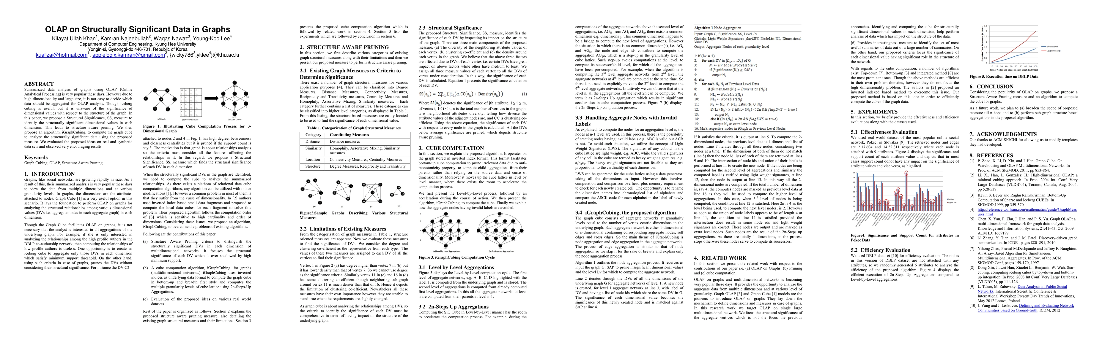 The paper proposes a Structural Significance (SS) measure and an algorithm, iGraphCubing, to identify and compute the cube for structurally significant dimensional values in graphs for OLAP analysis, focusing on structural significance and addressing high dimensionality issues.