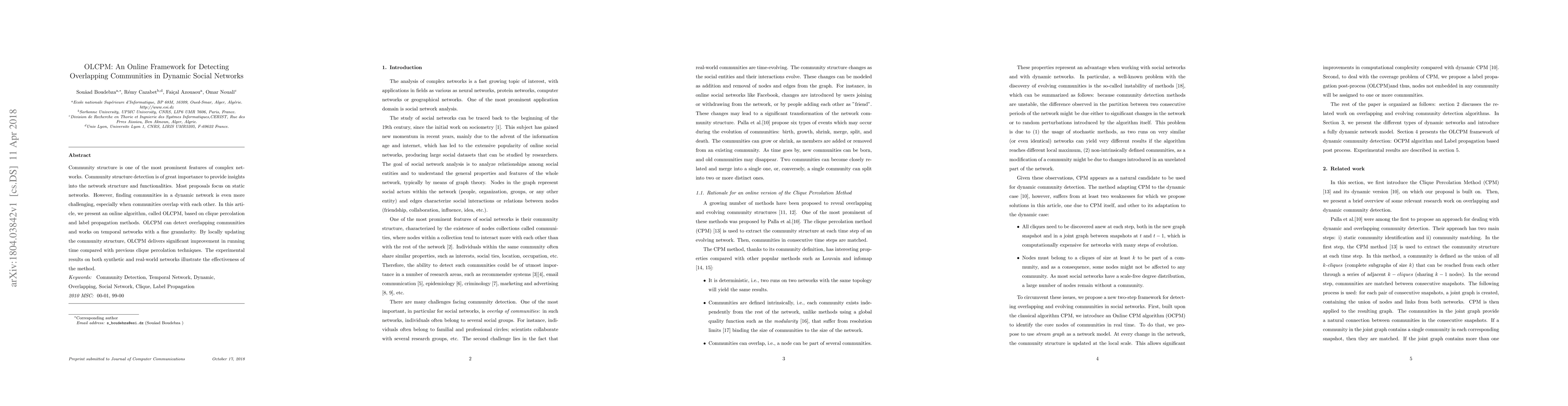 OLCPM is an online algorithm for detecting overlapping communities in dynamic social networks, using clique percolation and label propagation. It significantly improves running time compared to traditional methods and performs well on both synthetic and real-world networks.