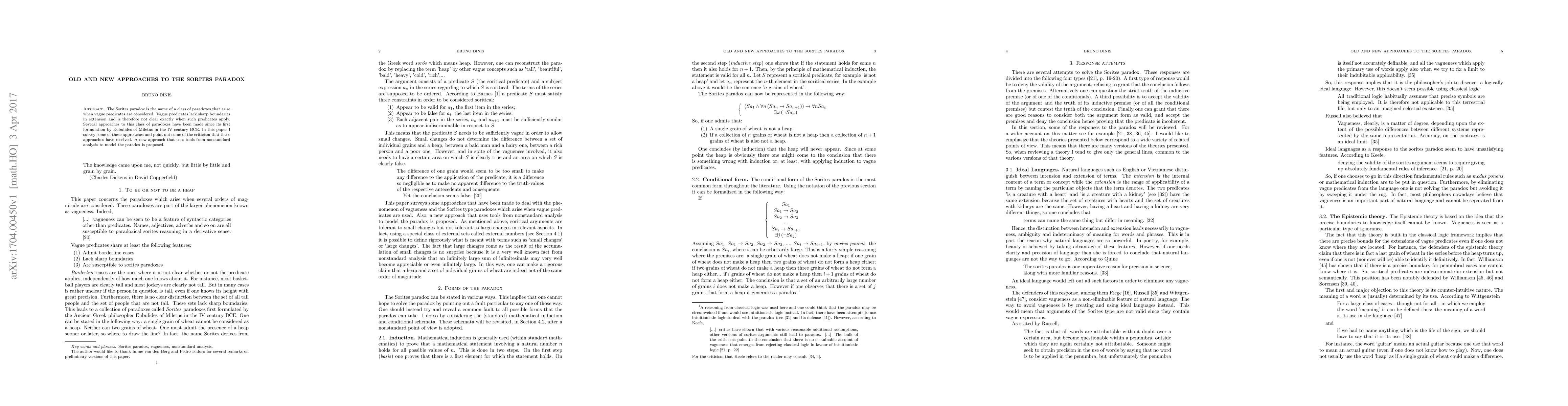 The Sorites paradox is the name of a class of paradoxes that arise when vague predicates are considered. Vague predicates lack sharp boundaries in extension and is therefore not clear exactly when such predicates apply. Several approaches to this class of paradoxes have been made since its first formulation by Eubulides of Miletus in the IV century BCE. In this paper I survey some of these approaches and point out some of the criticism that these approaches have received. A new approach that uses tools from nonstandard analysis to model the paradox is proposed.