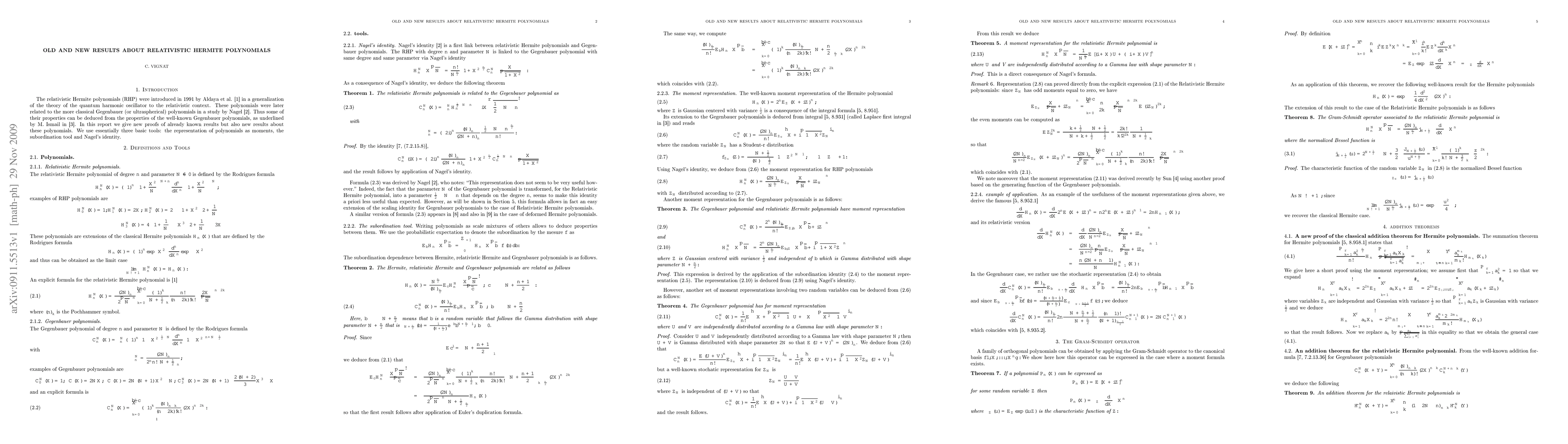 This paper presents new proofs and additional results regarding relativistic Hermite polynomials, which were introduced to generalize the quantum harmonic oscillator to a relativistic framework. It leverages the connection between these polynomials and classical Gegenbauer polynomials, employing tools like moments representation, subordination, and Nagel's identity.