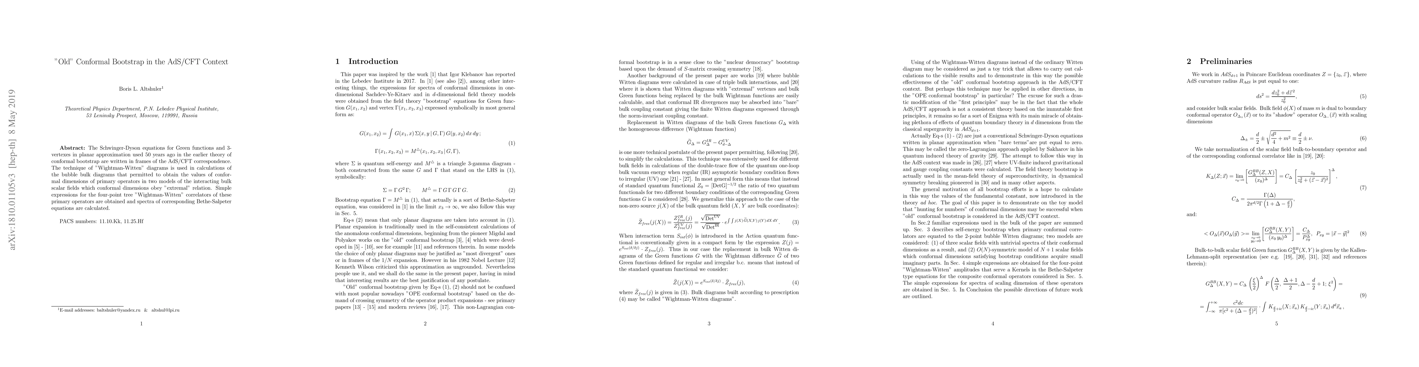 This paper reexamines the "old" conformal bootstrap techniques within the AdS/CFT framework, using Schwinger-Dyson equations and "Wightman-Witten" diagrams to determine conformal dimensions of primary operators in interacting scalar field models. The study derives simple expressions for four-point tree correlators and computes the spectra of corresponding Bethe-Salpeter equations.