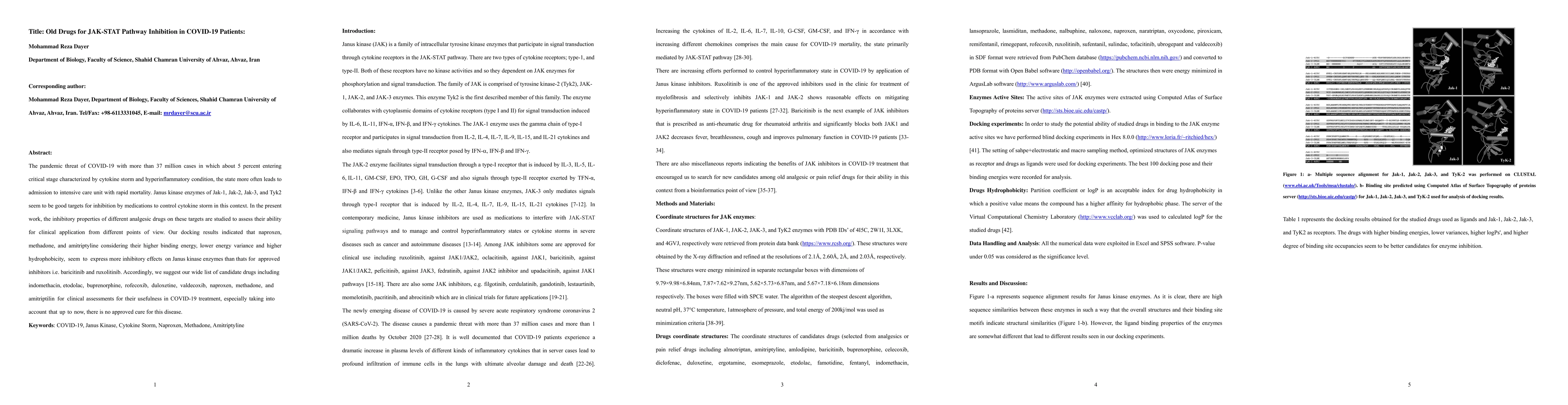 The pandemic threat of COVID-19 with more than 37 million cases in which about 5 percent entering critical stage characterized by cytokine storm and hyperinflammatory condition, the state more often leads to admission to intensive care unit with rapid mortality. Janus kinase enzymes of Jak-1, Jak-2, Jak-3, and Tyk2 seem to be good targets for inhibition by medications to control cytokine storm in this context. In the present work, the inhibitory properties of different analgesic drugs on these targets are studied to assess their ability for clinical application from different points of view. Our docking results indicated that naproxen, methadone, and amitriptyline considering their higher binding energy, lower energy variance, and higher hydrophobicity, seem to express more inhibitory effects on Janus kinase enzymes than thats for approved inhibitors i.e. baricitinib and ruxolitinib. Accordingly, we suggest our wide list of candidate drugs including indomethacin, etodolac, buprenorphine, rofecoxib, duloxetine, valdecoxib, naproxen, methadone, and amitriptilin for clinical assessments for their usefulness in COVID-19 treatment, especially taking into account that up to now, there is no approved cure for this disease.
