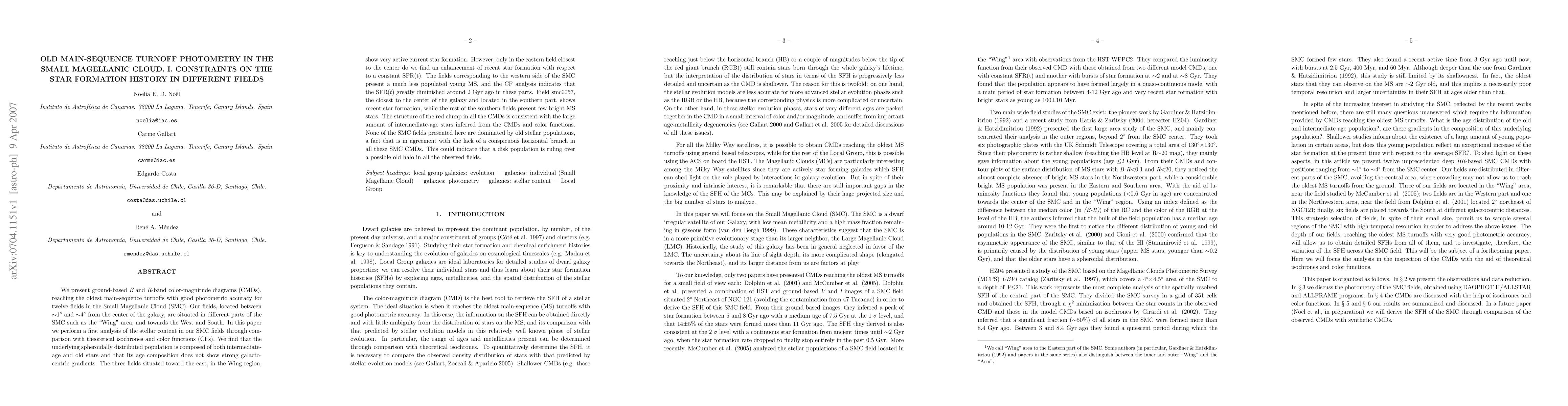 This paper analyzes B and R-band color-magnitude diagrams for twelve fields in the Small Magellanic Cloud, revealing a mix of intermediate-age and old stars with no significant galacto-centric gradients. Active star formation is noted in the eastern fields, while the western regions show a decline in star formation around 2 Gyr ago.