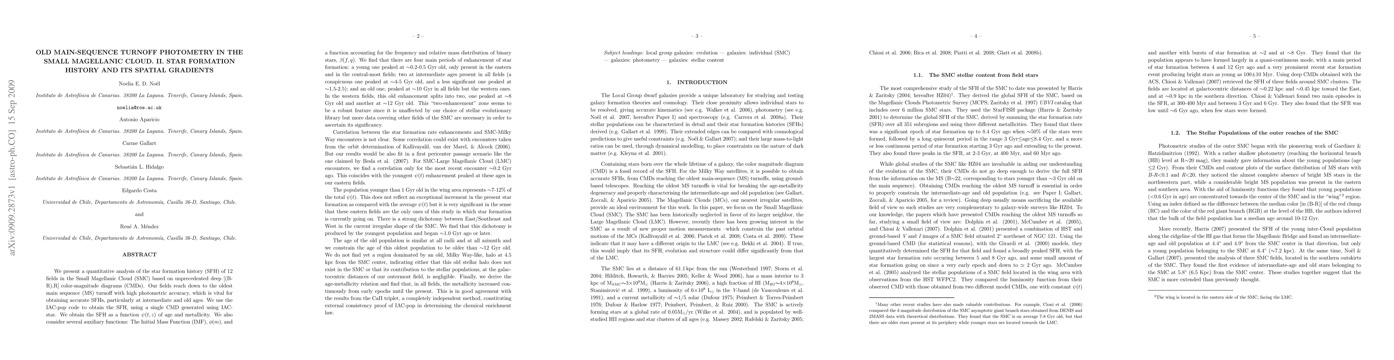 This study analyzes the star formation history (SFH) in 12 fields of the Small Magellanic Cloud (SMC), identifying four main periods of star formation enhancements. A dichotomy between eastern/southeastern and western regions is noted, primarily driven by the youngest population, suggesting a recent shaping event. The metallicity has increased continuously since early epochs.