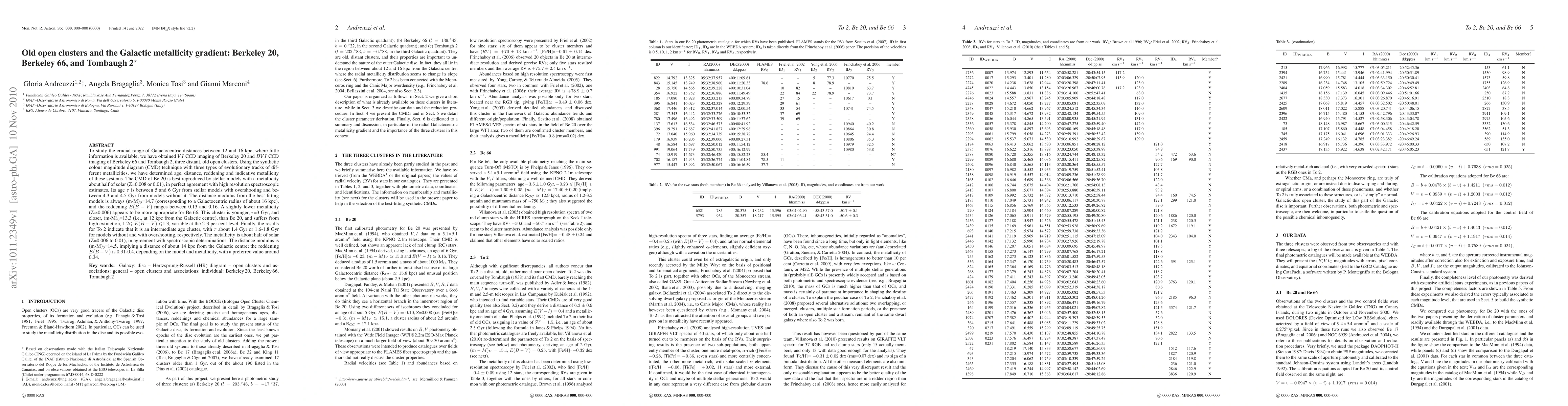 This paper investigates the metallicity gradient in the Galactic disk using three old open clusters (Berkeley 20, Berkeley 66, and Tombaugh 2) located between 12 and 16 kpc from the Galactic center. The study finds that Berkeley 20 has a metallicity about half of solar, an age between 4.3 and 6 Gyr, and is located at 16 kpc with moderate reddening. Berkeley 66 is younger at 3 Gyr, has slightly lower metallicity, and is closer to the Galactic center at 12 kpc with higher reddening. Tombaugh 2 is an intermediate-age cluster with an age of about 1.4 to 1.8 Gyr, similar metallicity to Berkeley 20, and located at 14 kpc with reddening around 0.34.