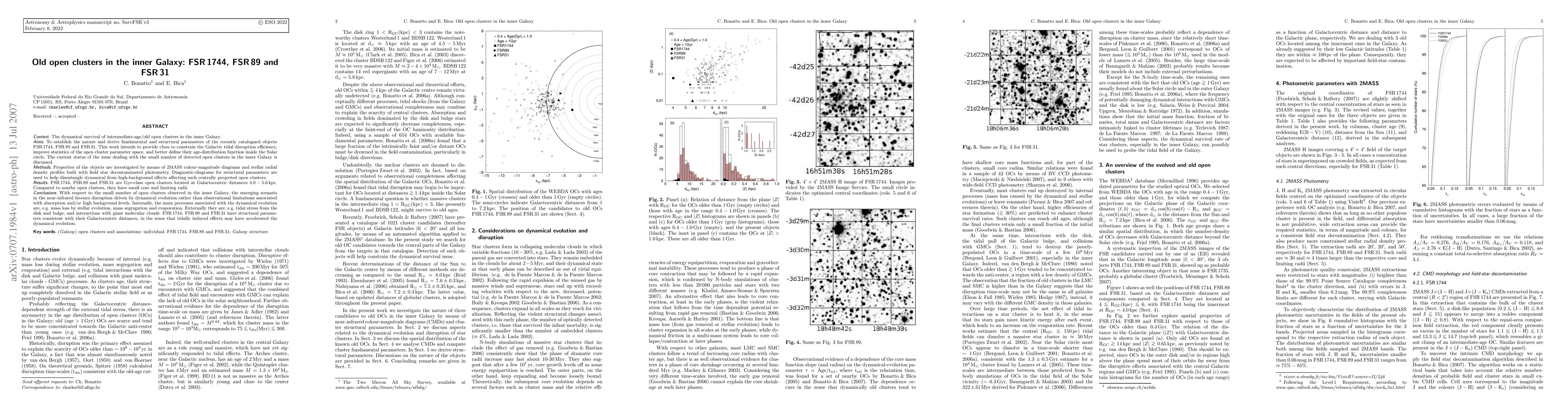 We establish the nature and derive fundamental and structural parameters of the recently catalogued objects FSR1744, FSR89 and FSR31. This work intends to provide clues to constrain the Galactic tidal disruption efficiency, improve statistics of the open cluster parameter space, and better define their age-distribution function inside the Solar circle. Properties of the objects are investigated by means of 2MASS colour-magnitude diagrams and stellar radial density profiles built with field star decontaminated photometry. Diagnostic-diagrams for structural parameters are used to help disentangle dynamical from high-background effects affecting such centrally projected open clusters. FSR1744, FSR89 and FSR31 are Gyr-class OCs located at Galactocentric distances 4.0 - 5.6kpc. Compared to nearby OCs, they have small core and limiting radii. With respect to the small number of OCs observed in the inner Galaxy, the emerging scenario in the near-infrared favours disruption driven by dynamical evolution rather than observational limitations associated with absorption and/or high background levels. Internally, the main processes associated with the dynamical evolution are, e.g. mass loss by stellar evolution, mass segregation and evaporation. Externally they are, e.g. tidal stress from the disk and bulge, and interactions with giant molecular clouds. FSR1744, FSR89 and FSR31 have structural parameters consistent with their Galactocentric distances, in the sense that tidally induced effects may have accelerated the dynamical evolution.