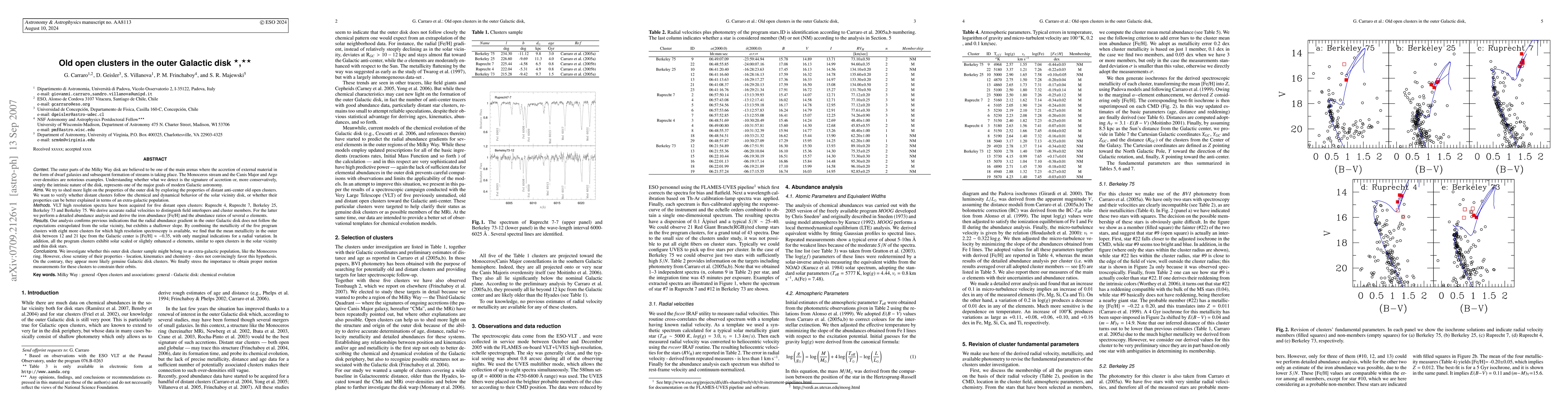 The outer parts of the Milky Way disk are believed to be one of the main arenas where the accretion of external material in the form of dwarf galaxies and subsequent formation of streams is taking place. The Monoceros stream and the Canis Major and Argo over-densities are notorious examples. VLT high resolution spectra have been acquired for five distant open clusters. We derive accurate radial velocities to distinguish field interlopers and cluster members. For the latter we perform a detailed abundance analysis and derive the iron abundance [Fe/H] and the abundance ratios of several $\alpha$ elements. Our analysis confirms previous indications that the radial abundance gradient in the outer Galactic disk does not follow the expectations extrapolated from the solar vicinity, but exhibits a shallower slope. By combining the metallicity of the five program clusters with eight more clusters for which high resolution spectroscopy is available, we find that the mean metallicity in the outer disk between 12 and 21 kpc from the Galactic center is [Fe/H] $\approx -0.35$, with only marginal indications for a radial variation. In addition, all the program clusters exhibit solar scaled or slightly enhanced $\alpha$ elements, similar to open clusters in the solar vicinity and thin disk stars. We investigate whether this outer disk cluster sample might belong to an extra-galactic population, like the Monoceros ring. However, close scrutiny of their properties - location, kinematics and chemistry - does not convincingly favor this hypothesis. On the contrary, they appear more likely genuine Galactic disk clusters. We finally stress the importance to obtain proper motion measurements for these clusters to constrain their orbits.