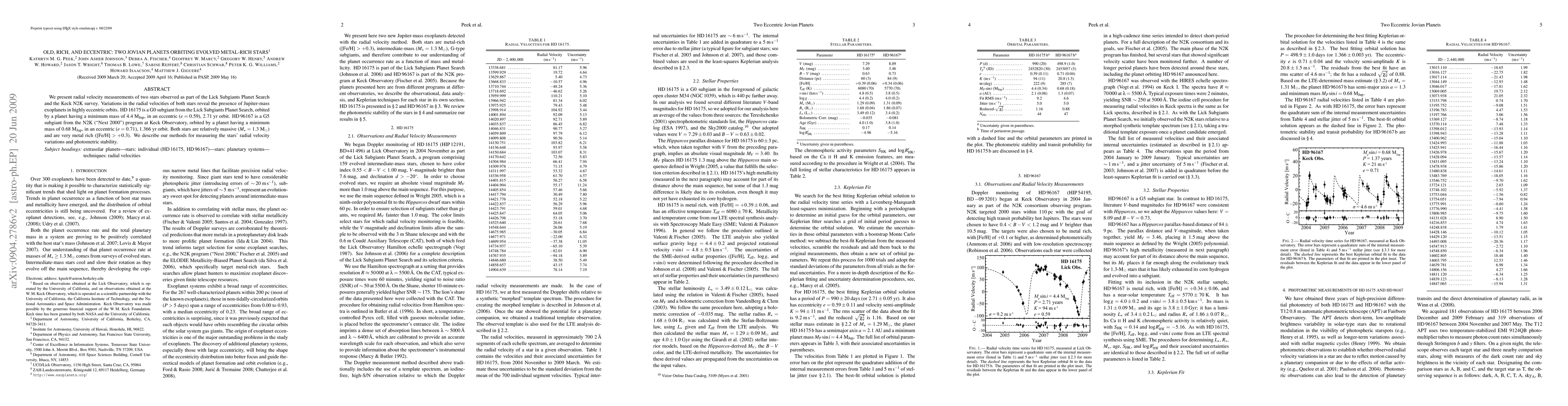 This paper reports the discovery of two eccentric Jupiter-mass exoplanets orbiting evolved, metal-rich subgiant stars. HD 16175 hosts a planet with 4.4 M_Jup in a 2.71 yr orbit, while HD 96167 has a planet with 0.68 M_Jup in a 1.366 yr orbit, both with significant eccentricities.