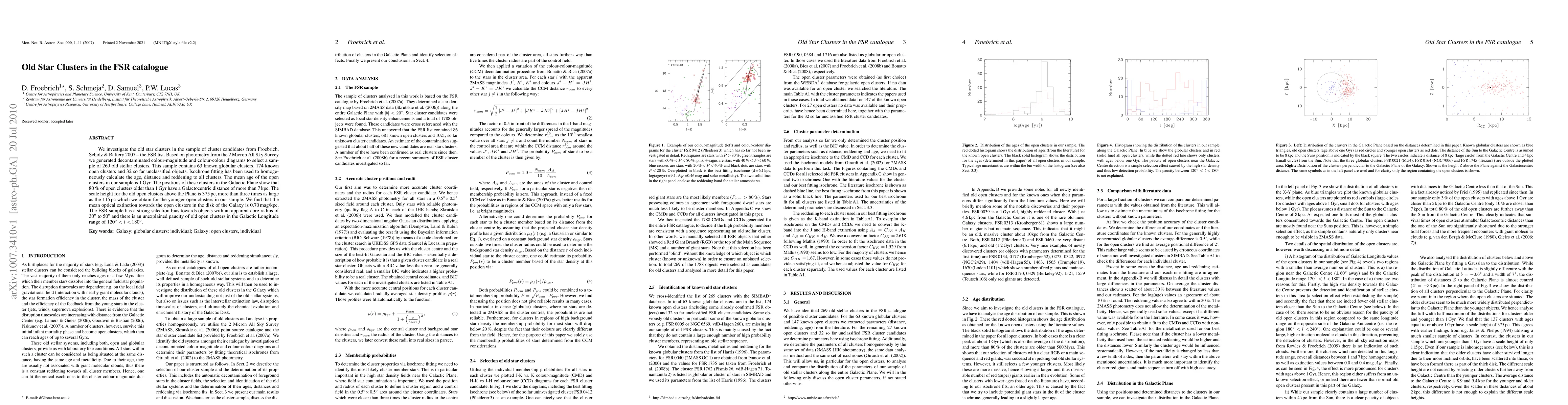 We investigate the old star clusters in the sample of cluster candidates from Froebrich, Scholz & Raftery 2007 -- the FSR list. Based on photometry from the 2-Micron All Sky Survey we generated decontaminated colour-magnitude and colour-colour diagrams to select a sample of 269 old stellar clusters. This sample contains 63 known globular clusters, 174 known open clusters and 32 so far unclassified objects. Isochrone fitting has been used to homogeneously calculate the age, distance and reddening to all clusters. The mean age of the open clusters in our sample is 1Gyr. The positions of these clusters in the Galactic Plane show that 80% of open clusters older than 1Gyr have a Galactocentric distance of more than 7kpc. The scale height for the old open clusters above the Plane is 375pc, more than three times as large as the 115pc which we obtain for the younger open clusters in our sample. We find that the mean optical extinction towards the open clusters in the disk of the Galaxy is 0.70mag/kpc. The FSR sample has a strong selection bias towards objects with an apparent core radius of 30" to 50" and there is an unexplained paucity of old open clusters in the Galactic Longitude range of 120deg < l < 180deg.