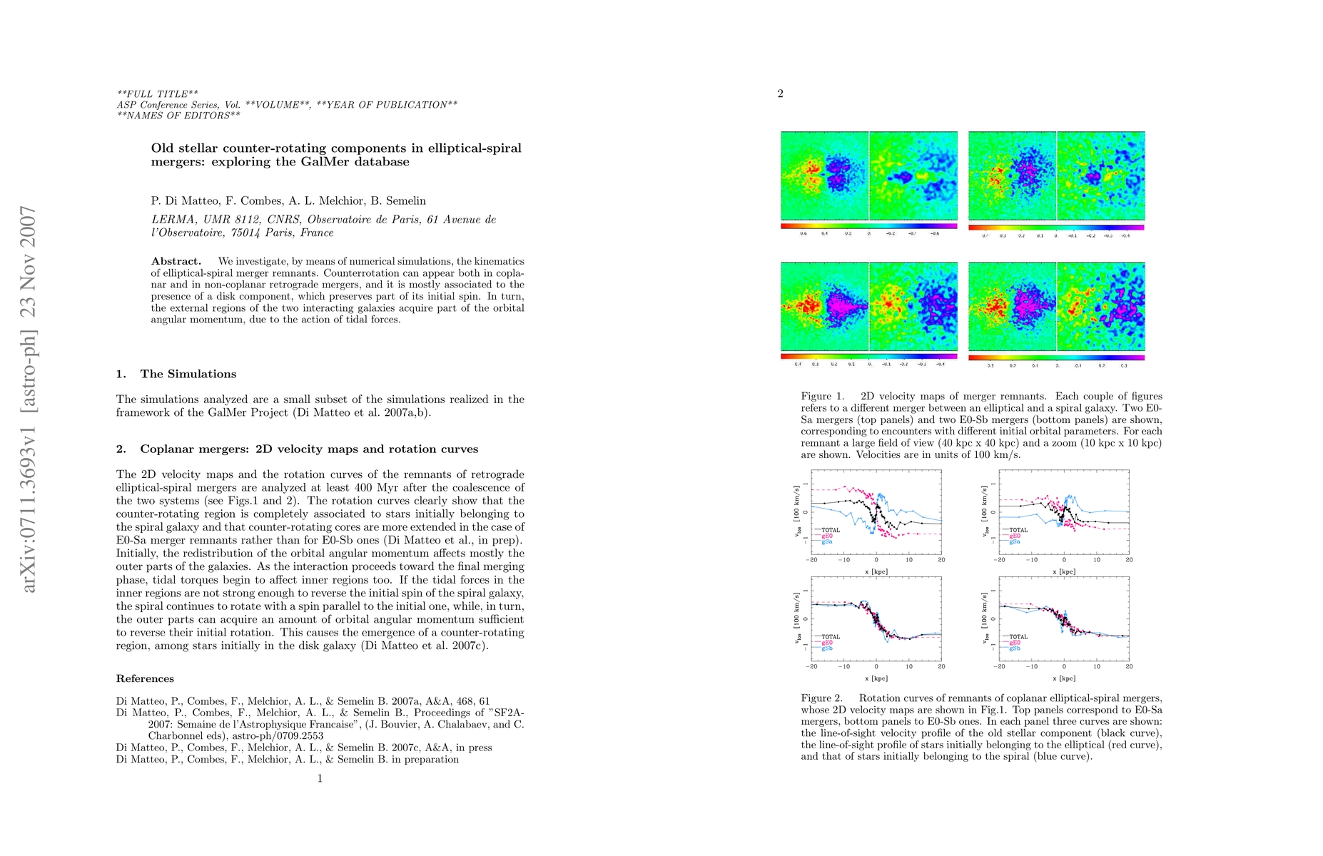 Numerical simulations explored the kinematics of elliptical-spiral merger remnants, revealing counterrotation linked to disk preservation and tidal forces transferring orbital angular momentum to external galaxy regions.