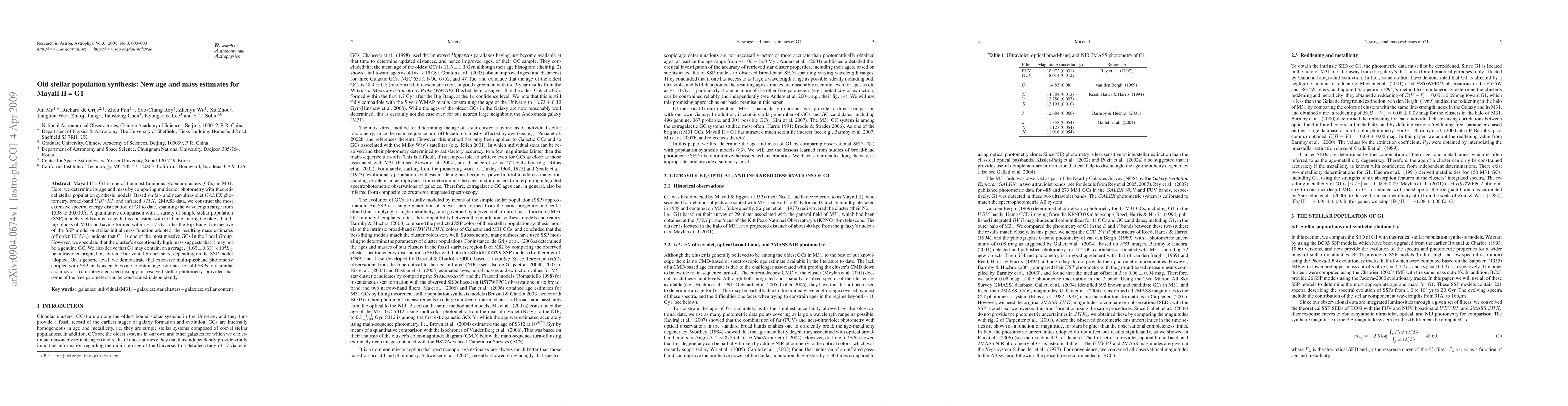Mayall II = G1 is one of the most luminous globular clusters (GCs) in M31. Here, we determine its age and mass by comparing multicolor photometry with theoretical stellar population synthesis models. Based on far- and near-ultraviolet GALEX photometry, broad-band UBVRI, and infrared JHK_s 2MASS data, we construct the most extensive spectral energy distribution of G1 to date, spanning the wavelength range from 1538 to 20,000 A. A quantitative comparison with a variety of simple stellar population (SSP) models yields a mean age that is consistent with G1 being among the oldest building blocks of M31 and having formed within ~1.7 Gyr after the Big Bang. Irrespective of the SSP model or stellar initial mass function adopted, the resulting mass estimates (of order $10^7 M_\odot$) indicate that G1 is one of the most massive GCs in the Local Group. However, we speculate that the cluster's exceptionally high mass suggests that it may not be a genuine GC. We also derive that G1 may contain, on average, $(1.65\pm0.63)\times10^2 L_\odot$ far-ultraviolet-bright, hot, extreme horizontal-branch stars, depending on the SSP model adopted. On a generic level, we demonstrate that extensive multi-passband photometry coupled with SSP analysis enables one to obtain age estimates for old SSPs to a similar accuracy as from integrated spectroscopy or resolved stellar photometry, provided that some of the free parameters can be constrained independently.