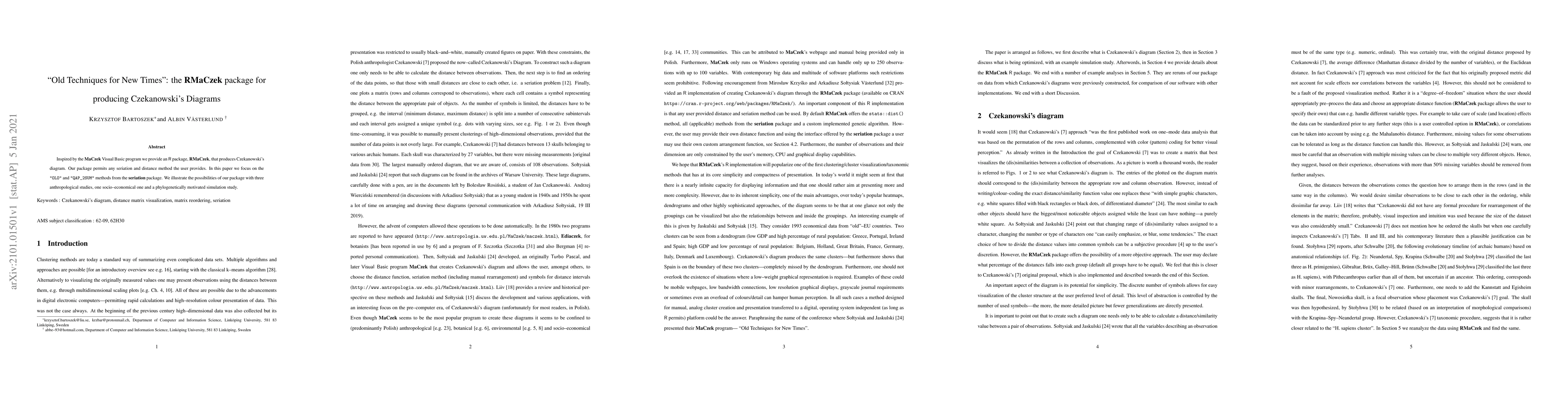 Inspired by the MaCzek Visual Basic program we provide an R package, RMaCzek, that produces Czekanowski's diagram. Our package permits any seriation and distance method the user provides. In this paper we focus on the OLO and QAP_2SUM methods from the seriation package. We illustrate the possibilities of our package with three anthropological studies, one socio-economical one and a phylogenetically motivated simulation study.