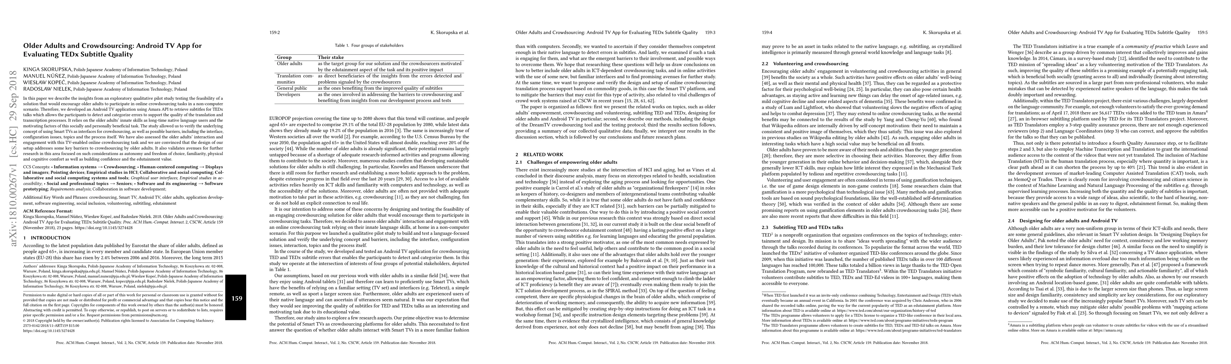 This study explores the feasibility of using an Android TV app to engage older adults in crowdsourcing for evaluating TEDx subtitles, finding that Smart TVs can serve as effective interfaces. The pilot study identifies barriers and confirms the potential for enhancing older adults' participation through design considerations that boost autonomy and comfort.