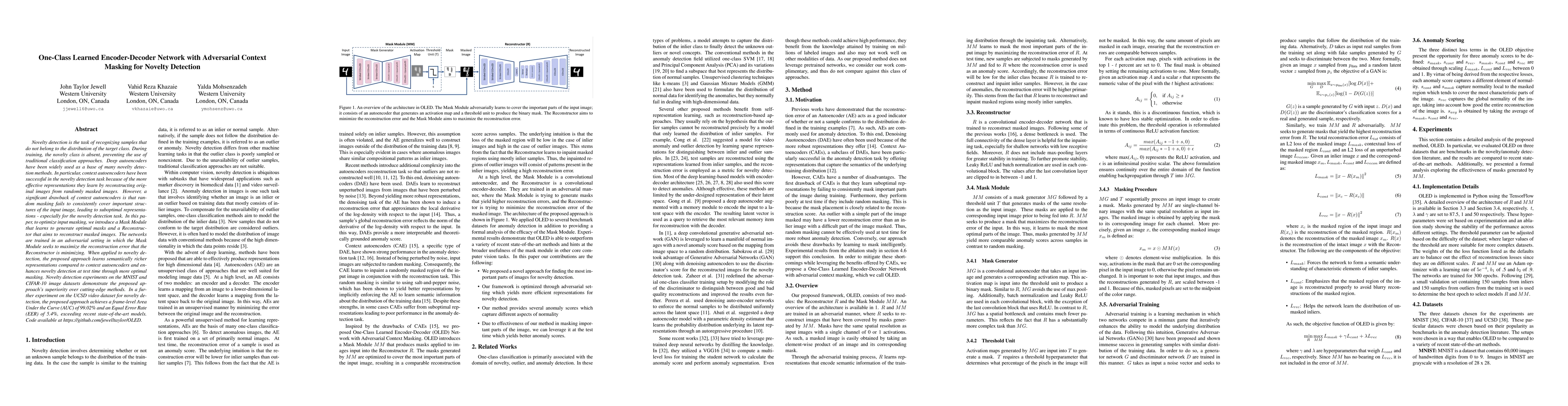 A new approach for novelty detection uses a two-network framework with adversarial training to generate optimal masks for images, leading to improved representations and state-of-the-art results on image and video datasets.