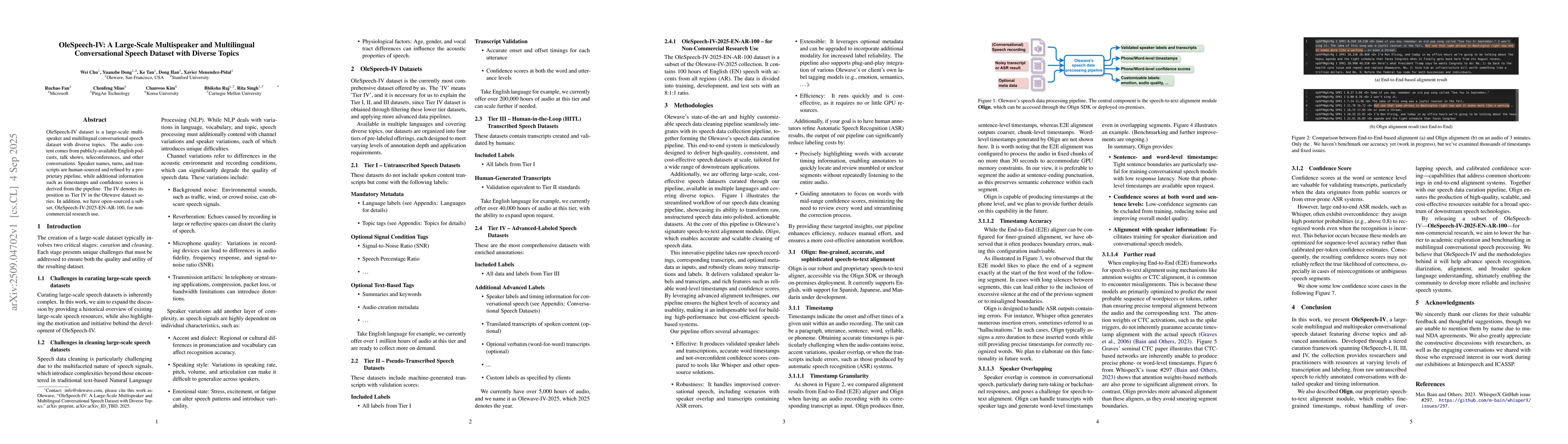 OleSpeech-IV dataset is a large-scale multispeaker and multilingual conversational speech dataset with diverse topics. The audio content comes from publicly-available English podcasts, talk shows, teleconferences, and other conversations. Speaker names, turns, and transcripts are human-sourced and refined by a proprietary pipeline, while additional information such as timestamps and confidence scores is derived from the pipeline. The IV denotes its position as Tier IV in the Olewave dataset series. In addition, we have open-sourced a subset, OleSpeech-IV-2025-EN-AR-100, for non-commercial research use.