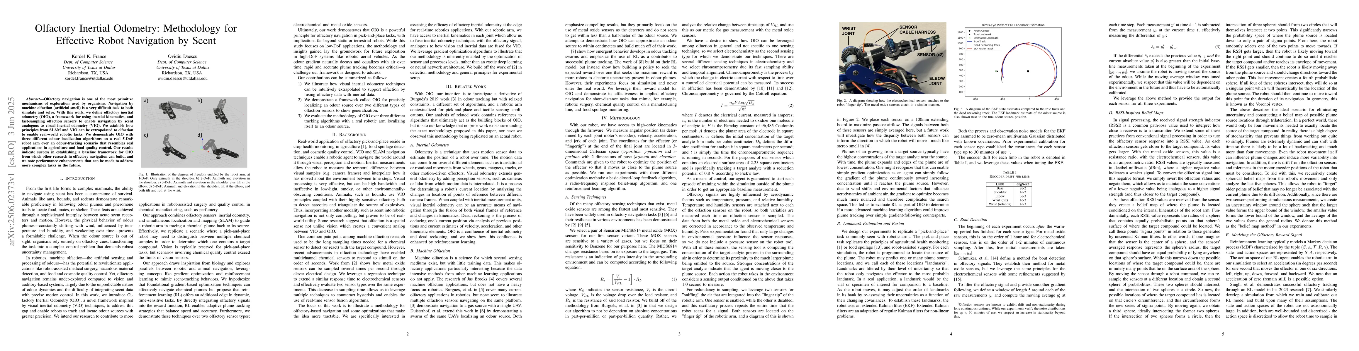 The research introduces olfactory inertial odometry (OIO), a framework combining inertial kinematics and fast-sampling olfaction sensors for robot navigation by scent, inspired by visual inertial odometry (VIO).