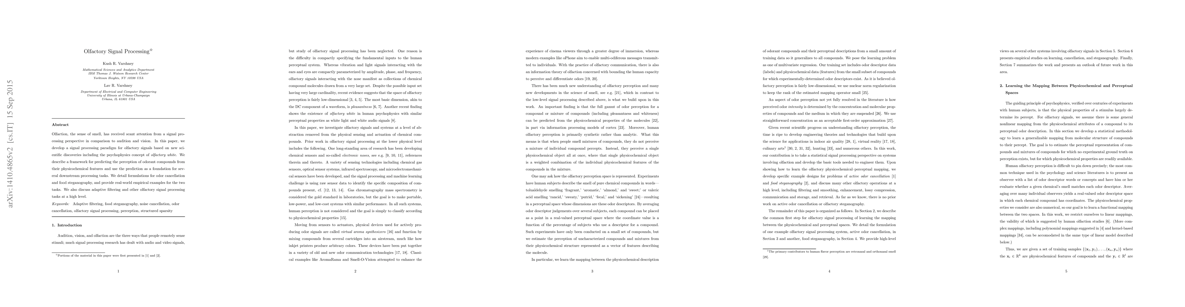 The paper develops a signal processing paradigm for olfactory signals based on new scientific discoveries, including the psychophysics concept of olfactory white. It details formulations for odor cancellation and food steganography, using a learned perceptual mapping from physicochemical features to odor descriptors.
