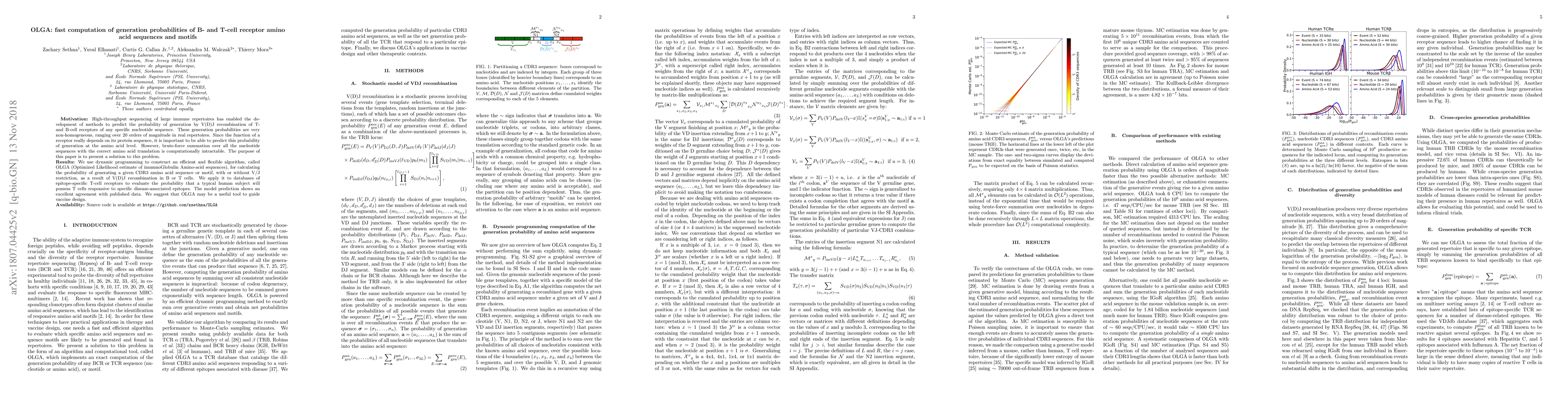 This paper introduces OLGA, a dynamic programming algorithm for efficiently calculating generation probabilities of B- and T-cell receptor amino acid sequences via V(D)J recombination. The method provides accurate predictions that can guide vaccine design by evaluating the likelihood of T-cell responses to specific epitopes.