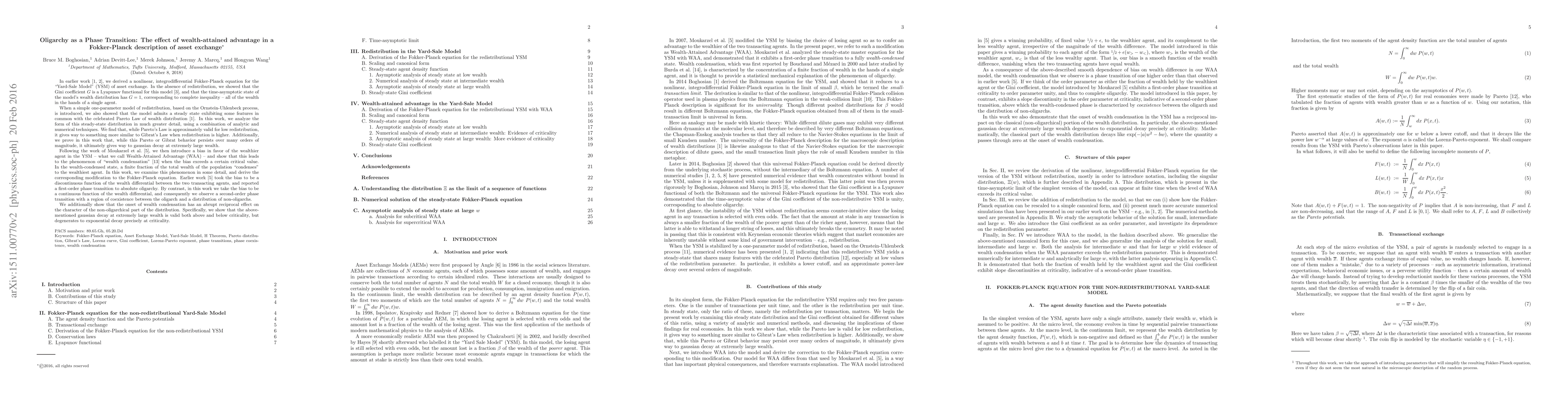 This paper examines wealth distribution dynamics in asset exchange using a Fokker-Planck model, revealing a second-order phase transition to oligarchy when wealth-based biases are introduced. It shows that redistribution alters the distribution from Pareto's Law to Gibrat's Law, and finally to Gaussian decay, with a critical transition point leading to wealth condensation.