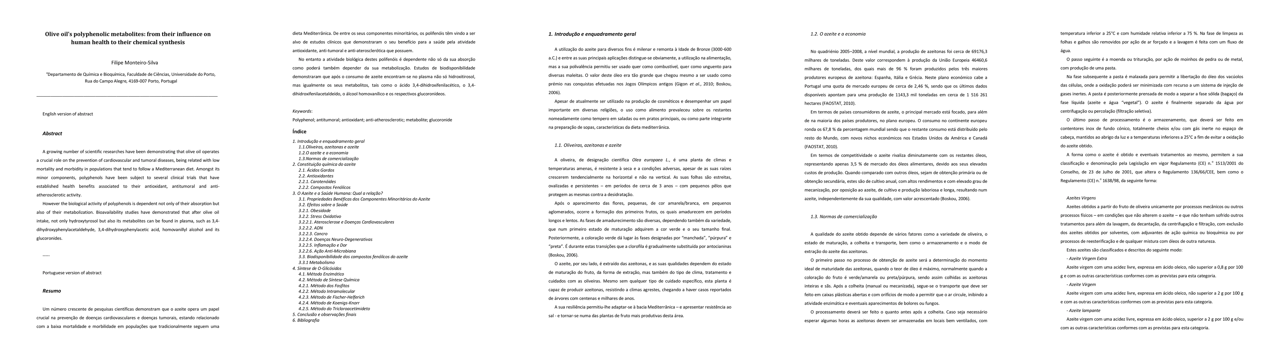 English version of abstract A growing number of scientific researches have been demonstrating that olive oil operates a crucial role on the prevention of cardiovascular and tumoral diseases, being related with low mortality and morbidity in populations that tend to follow a Mediterranean diet. Amongst its minor components, polyphenols have been subject to several clinical trials that have established health benefits associated to their antioxidant, antitumoral and anti-atherosclerotic activity. However the biological activity of polyphenols is dependent not only of their absorption but also of their metabolization. Bioavailability studies have demonstrated that after olive oil intake, not only hydroxytyrosol but also its metabolites can be found in plasma, such as 3,4-dihydroxyphenylacetaldehyde, 3,4-dihydroxyphenylacetic acid, homovanillyl alcohol and its glucoronides. ----- Portuguese version of abstract Um numero crescente de pesquisas cientificas demonstram que o azeite opera um papel crucial na preven\c{c}ao de doen\c{c}as cardiovasculares e doen\c{c}as tumorais, estando relacionado com a baixa mortalidade e morbilidade em popula\c{c}oes que tradicionalmente seguem uma dieta Mediterranica. De entre os seus componentes minorit\'arios, os polifenois t\^em vindo a ser alvo de estudos clinicos que demonstraram o seu benef\'icio para a saude pela atividade antioxidante, anti-tumoral e anti-aterosclerotica que possuem. No entanto a atividade biol\'ogica destes polifenois \'e dependente nao s\'o da sua absor\c{c}ao como poder\'a tambem depender da sua metaboliza\c{c}ao. Estudos de biodisponibilidade demonstraram que ap\'os o consumo de azeite encontram-se no plasma nao s\'o hidroxitirosol, mas igualmente os seus metabolitos, tais como o \'acido 3,4-dihidroxifenilacetico, o 3,4-dihidroxifenilacetaldeido, o \'alcool homovanilico e os respectivos glucoronideos.