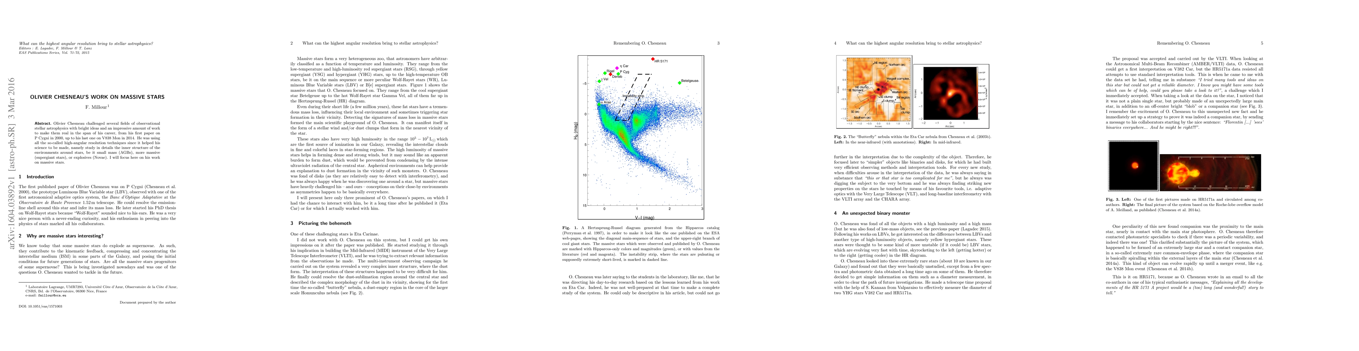 Olivier Chesneau challenged several fields of observational stellar astrophysics with bright ideas and an impressive amount of work to make them real in the span of his career, from his first paper on P Cygni in 2000, up to his last one on V838 Mon in 2014. He was using all the so-called high-angular resolution techniques since it helped his science to be made, namely study in details the inner structure of the environments around stars, be it small mass (AGBs), more massive (supergiant stars), or explosives (Novae). I will focus here on his work on massive stars.